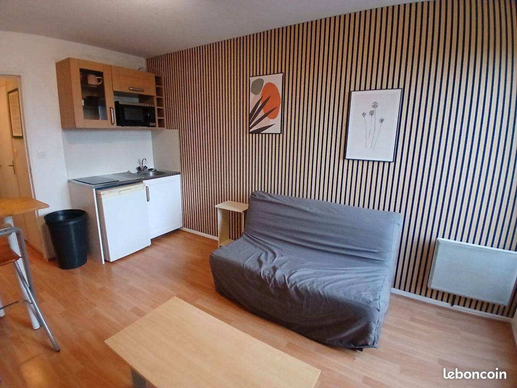 Studio meublé au 1er étage (18m2) + 1 place de parking Vue dégagée Entrée avec grand placard Pièce principale avec parquet au sol: - Kitchinette (frigo, plaques, rangements) - Micro ondes - Petit four - Plan repas + chaises - Canapé lit - Table basse - Bureau Salle de bain / Wc Parking privé Au calme et Sans vis à vis Proche campus des Cézeaux, Chu et parc technologique de la Pardieu Loyer: 390€ Charges: 60€ (nettoyage/électricité des communs, eau chaude et froide, chauffage collectif) Total mensuel : 450€ Seul l'EDF reste à charge Caution: 390€ + garant