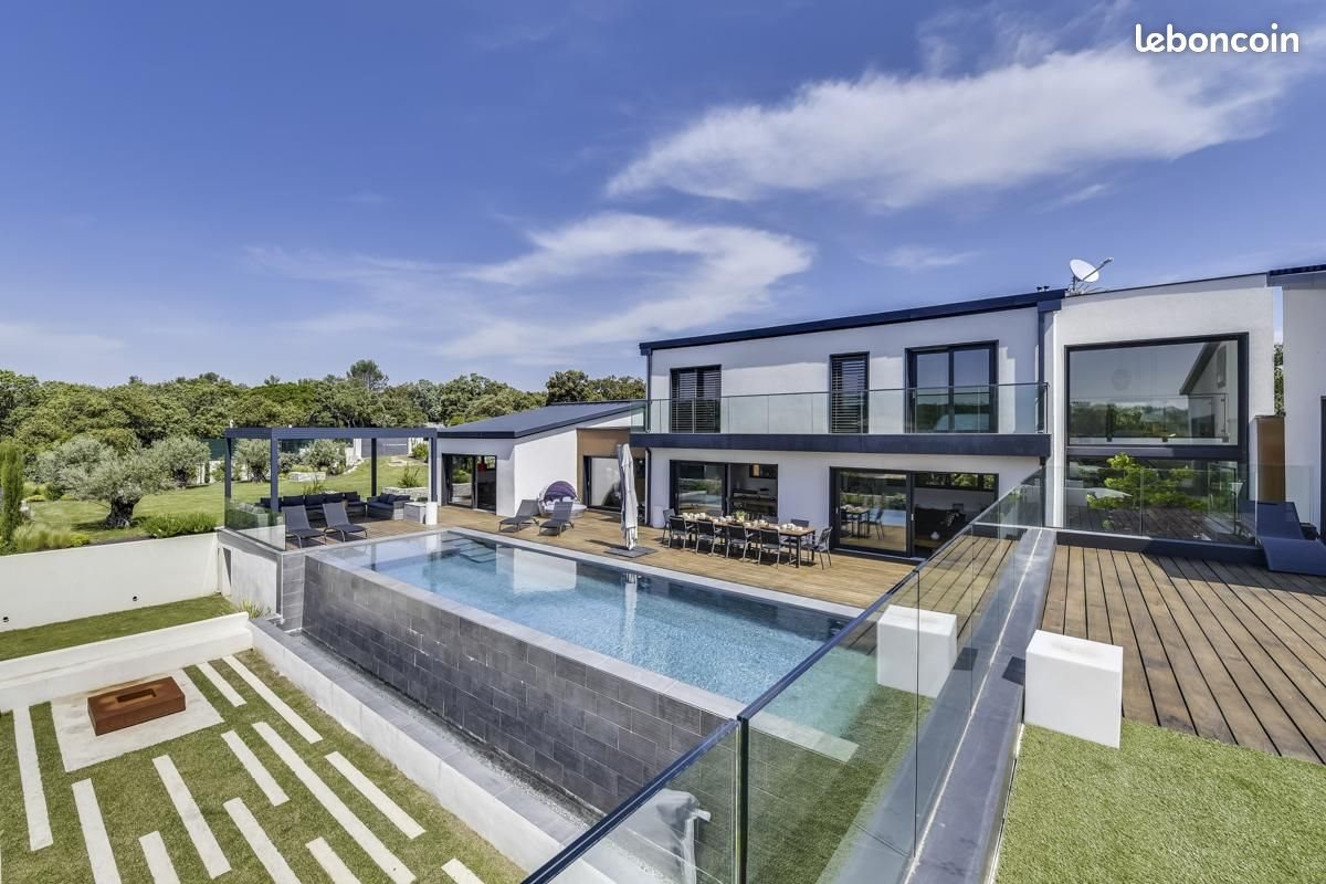 La grande piscine chauffée sur la terrasse en bois est un atout majeur, s'intégrant harmonieusement aux lignes modernes du jardin. Pelouse lumineuse, allées de galets blancs et oliviers soigneusement entretenus complètent l'ensemble. Une pergola bioclimatique avec canapés d'extérieur, une grande terrasse avec barbecue et un jacuzzi chauffé sur la terrasse supérieure agrémentent les espaces extérieurs.