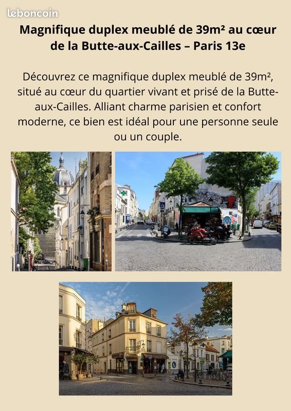 Découvrez ce magnifique duplex meublé de 39m², situé au cœur du quartier vivant et prisé de la Butte-aux-Cailles. Alliant charme parisien et confort moderne, ce bien est idéal pour une personne seule ou un couple. Le salon lumineux offre un canapé-lit confortable, un meuble Tv et une télévision grand angle, parfait pour se détendre. Un meuble de rangement sous l’escalier complète cet espace chaleureux et fonctionnel. La grande cuisine ouverte est entièrement équipée avec un réfrigérateur, une plaque à induction, un lave-vaisselle et une machine à laver-séchante neufs, ainsi que de nombreux rangements. Tout le nécessaire pour cuisiner est fourni : casseroles, poêles, assiettes, verres, tasses et couverts, ainsi qu’une cafetière Dolce Gusto et un micro-ondes neuf. Un toilette séparé complète ce niveau pour plus de [Url masquée pour votre sécurité] chambre cosy dispose d’un lit deux places et d’un grand bureau, avec rangements optimisés pour vos vêtements. La salle d’eau moderne inclut une douche, un meuble lavabo avec miroir, ainsi qu’un second toilette, alliant praticité et confort. Ce duplex unique combine confort, fonctionnalité et charme parisien. Il est situé dans un quartier unique et artistique, plein de bonnes adresses, cafés et commerces de proximité, avec les métros à quelques pas pour rejoindre facilement le reste de Paris. Une opportunité rare pour vivre au cœur de la capitale dans un cadre élégant et parfaitement équipé.