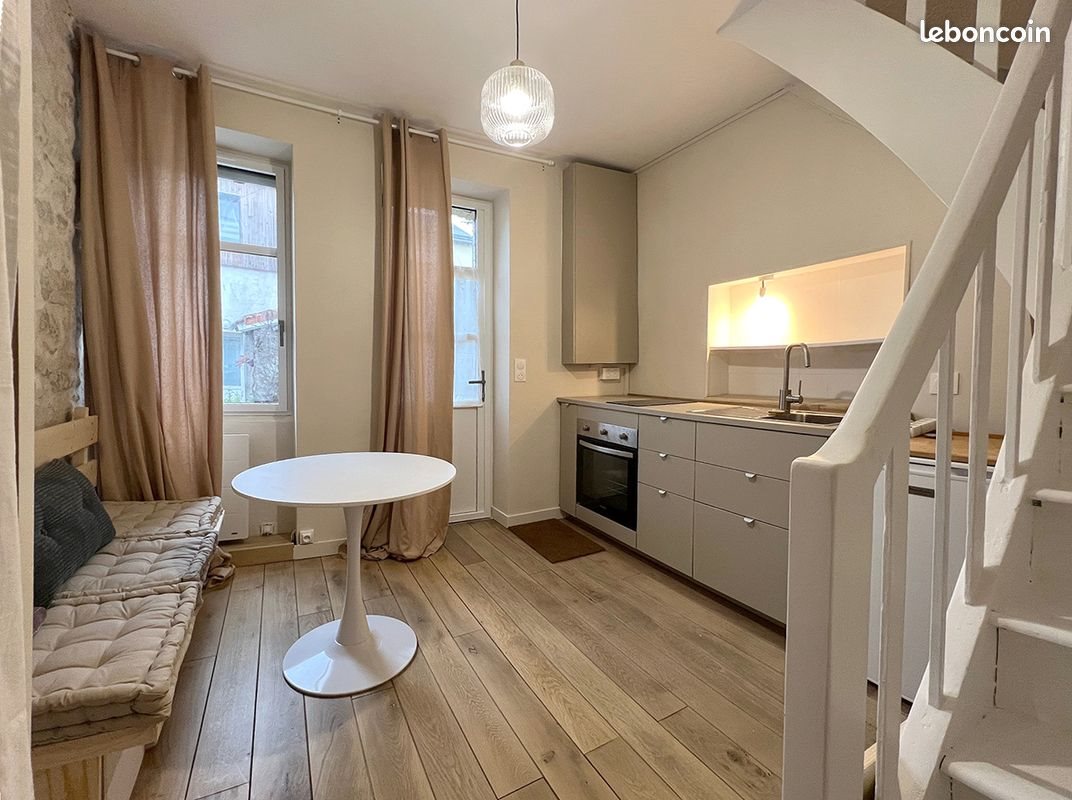 Nantes Zola St Clair, maisonnette rénovée Au calme Rdc pièce de vie avec cuisine aménagée et équipée (four, plaque induction, réfrigérateur, lave- linge,...) sur parquet, Au 1er petit salon/bureau, salle d'eau avec wc Dernier étage mezzanine/chambre lit 140 La maisonnette (sans copropriété) se situe sur une placette piétonne proche tram (ligne 1), commerces, cinéma Le Concorde, Libre (possible quelques jours plus tôt)
