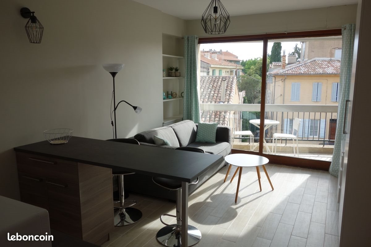Ce studio est idéalement situé au cœur d'Aix-en-Provence, à proximité notamment de : • la place de la Rotonde, à 300 m. • la gare routière, à 700 m. • la gare Sncf, à 700 m. L’Immeuble, très bien entretenu, dispose d’un interphone, de 2 portes sécurisées et d’un ascenseur. Lumineux Et Calme, ce studio dispose d'une grande baie vitrée orientée au Sud-Ouest, dont l'ouverture donne sur une ruelle très peu fréquentée. Ce studio, rénové et meublé, se compose de : • une entrée avec un double placard, • une salle de bain, comprenant meuble-vasque, douche, lave-linge et wc, • une partie cuisine, équipée (frigo, four, four micro-ondes, cuisson, hotte, cafetière, 2 chaises hautes), • une partie salon (canapé-lit, 1 table basse, 1 armoire, 1 commode, 1 télévision, des étagères), • un balcon, avec une table et 2 chaises. Ce studio dispose de tous les équipements utiles : • vaisselle, couverts, ustensiles de cuisine, • poubelle, serpillère, seau, balai, étendoir à linge, 1 chaise supplémentaire. Loyer mensuel de 690 € hors charges. Loyer mensuel de 740 € charges comprises, dont une provision de 50 € pour les charges de copropriété, l’enlèvement des ordures ménagères et l’entretien de la chaudière.