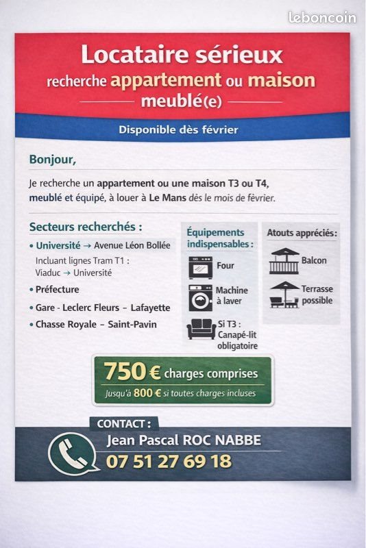 Je recherche un appartement ou une maison T3 ou T4 meublé(e) à louer à Le Mans, disponible dès février. Secteur souhaité : Avenue Léon Bollée jusqu’à Université, incluant ligne T1 et ses alentours : Ex: République, Préfecture, Comtes du Maine, Théodore Monod, Saint-Pavin. Critères indispensables : Surface minimum 60 m² Logement meublé T3 accepté uniquement avec canapé-lit dans le salon Cuisine équipée avec four et machine à laver Logement fonctionnel et bien entretenu Critères souhaités (non obligatoires mais appréciés) : Balcon Terrasse (notamment si maison) Place de parking Budget : 750 € maximum charges comprises Jusqu’à 800 € maximum si toutes les charges sont incluses (électricité, eau, chauffage, charges de copropriété) Charges souhaitées a minima : Eau chaude Chauffage Charges de copropriété Merci.
