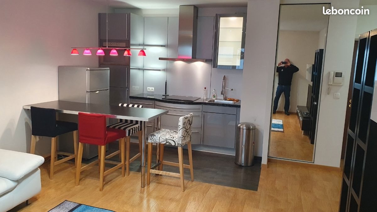 Splendide meublé avec des matériaux de qualité. Cuisine équipée + bureau+lampe+ salon cuir+tv, wc suspendu + douche+ vasque+sèche serviette + bac linge, aspirateur, lit avec matelas neuf . Appart non visible avant 22 /02/26