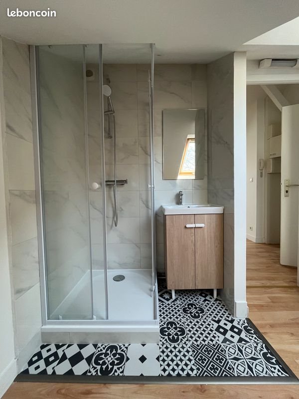 A Louer à Angers, rue Guittet (à côté Place Bichon), dans un immeuble calme de 8 lots, un appartement de deux pièces très lumineux situé au troisième et dernier étage, comprenant : - Une pièce de vie avec coin cuisine équipée avec Vmc (plaques vitro (2), réfrigérateur, évier, placard bas) – bibliothèque murale – un vélux - un retour sous forme de banque avec étagères en-dessous - un Wc indépendant avec Vmc - une chambre ouverte sur une salle de douche avec meuble vasque et glace au-dessus, Vmc – un vélux Interphone. Fibre optique dans l’appartement. Chauffage individuel par convecteur électrique. Eau sanitaire collectif compris dans les charges. Surface habitable totale : 10,05 m2 (loi Carrez) Surface au sol total : 23,45 m2 (surface utile - appartement mansardé) Pas de parking. Stationnement gratuit dans la rue à sens unique. Pas de balcon. Pas de cave. Appartement rénové et en excellent état. Loyer mensuel : 435 euros + 14 euros de charges (eau froide comprise) = 449 euros. Libre le 5 janvier 2026 Repondre à l’annonce par messagerie du « Bon Coin »