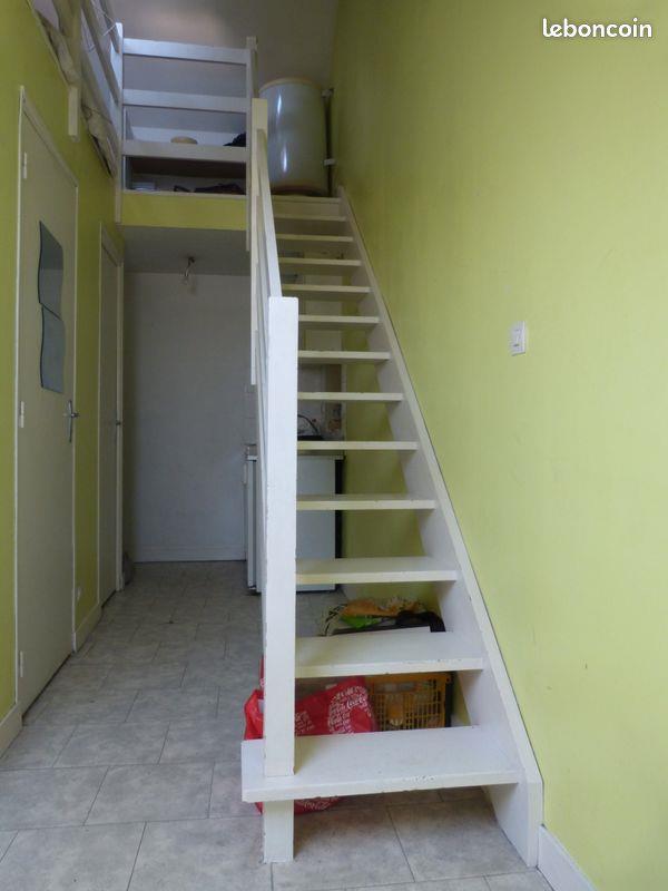 A louer studio de 18m2 + 6m2 en mezzanine pour le lit. Kitchénette. Une salle d'eau composée d'une cabine douche-lavabo-Wc séparé. Interphone. Eau comprise dans le loyer.