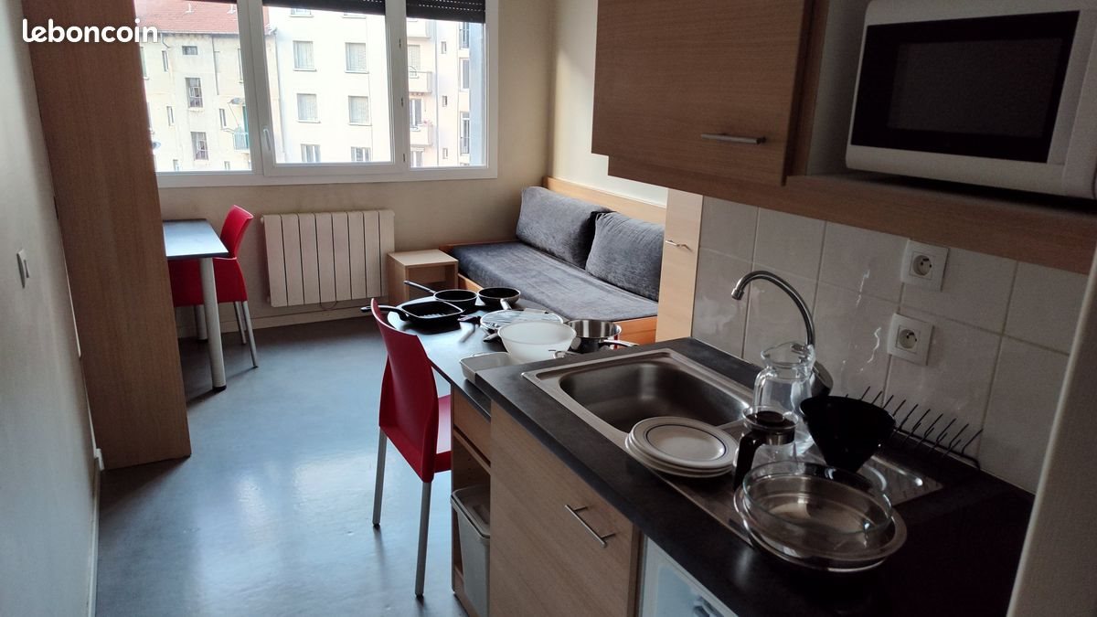 Situé au 4ᵉ d’un immeuble sécurisé (digicode) avec ascenseur, ce studio meublé de 17.2m² bénéficie d’une belle luminosité grâce à une vue dégagée sans vis-a-vis. Le logement se compose d’une kitchenette équipée : évier, plaques de cuisson, meubles de rangement, réfrigérateur, micro-ondes, vaisselle, couverts et ustensiles de cuisine,. D’Un espace repas avec une table et 2 chaises, un bureau avec chaise ainsi qu’un canapé lit 1 place. Couette, oreiller et draps fournis. Salle d’eau avec douche, lavabo, meuble vasque et Wc. Studio fonctionnel, agréable et bien agencé, parfait pour un étudiant ou un jeune actif. Idéalement placé dans l’hypercentre de Grenoble, à proximité des transports en commun (bus, tram C) et de toutes les commodités. Local à vélo. Eau chaude et chauffage individuel électrique. Eau froide collective. Dpe : D Ges : B Disponible le 21 Décembre 2025 Loyer : 440€ Avances de charges : 25 € (ascenseur, entretien des communs, eau froide) Dépôt de garantie :440 € Garant Obligatoire