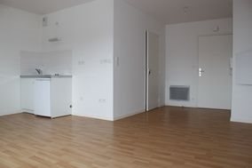 Appartement T1 31m2 quartier calme Gesvre Jonliere rue de la petite sensive 1er étage séjour avec placard fenetre donnant sur la rue avec bonne luminosité coin cuisine équipée plaques electrique et frigidaire salle 'eau avec douche et wc interphone et ascenseur