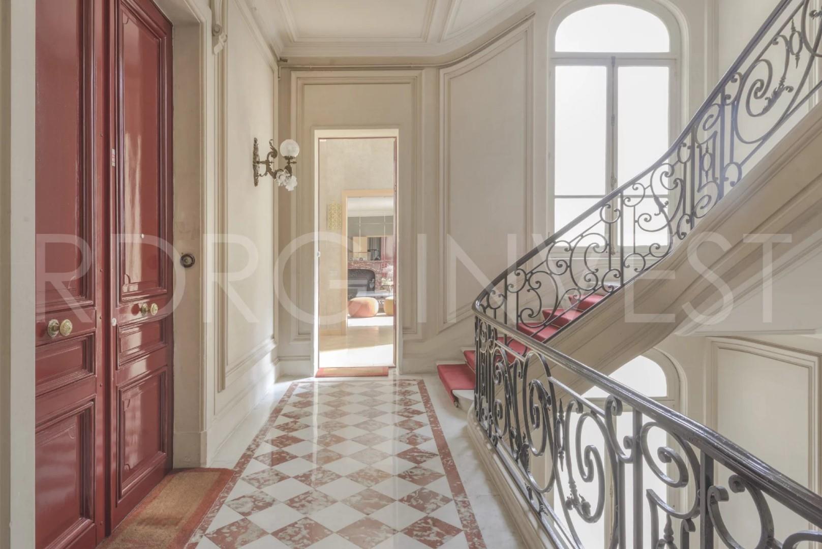 Situé entre la place Iéna et la place de l'Etoile, dans un très bel immeuble du XIXe siècle avec de magnifique parties communes, nous vous présentons un appartement d'une surface de 185m2 avec 3,80m de hauteur sous plafond se composant d'une entrée, d'un séjour avec grande cheminée d'époque et grande bibliothèque, d'une salle à manger, d'une chambre parentale avec salle de bains/wc et dressing, d'une chambre avec salle de bains /wc, d'une cuisine dinatoire équipée et d'un wc invité. Belles prestations Ascenseur et climatisation.