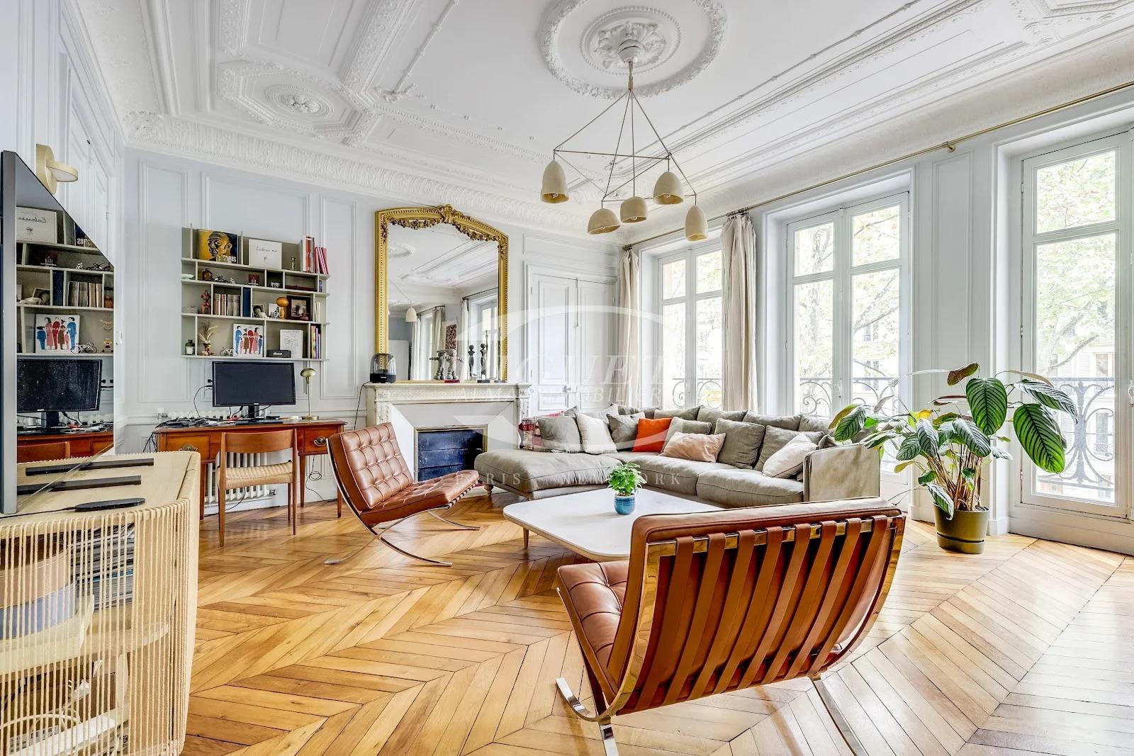 Quartier TRUDAINE Catherine Piguet vous invite à découvrir, à l'étage noble d'un magnifique immeuble Haussmannien un superbe appartement familial de 7 pièces entièrement rafraîchi. Les moulures prononcées, le parquet en point de Hongrie ainsi que les cheminées d'époque rappellent toute l'authenticité et le charme parisien. Trudaine DISTRICT Catherine Piguet invites you to discover, on the noble floor of a magnificent Haussmannian building, a stunning 7-room family apartment that has been fully refreshed. The pronounced moldings, herringbone parquet flooring, and period fireplaces highlight the authenticity and charm of classic Parisian style.