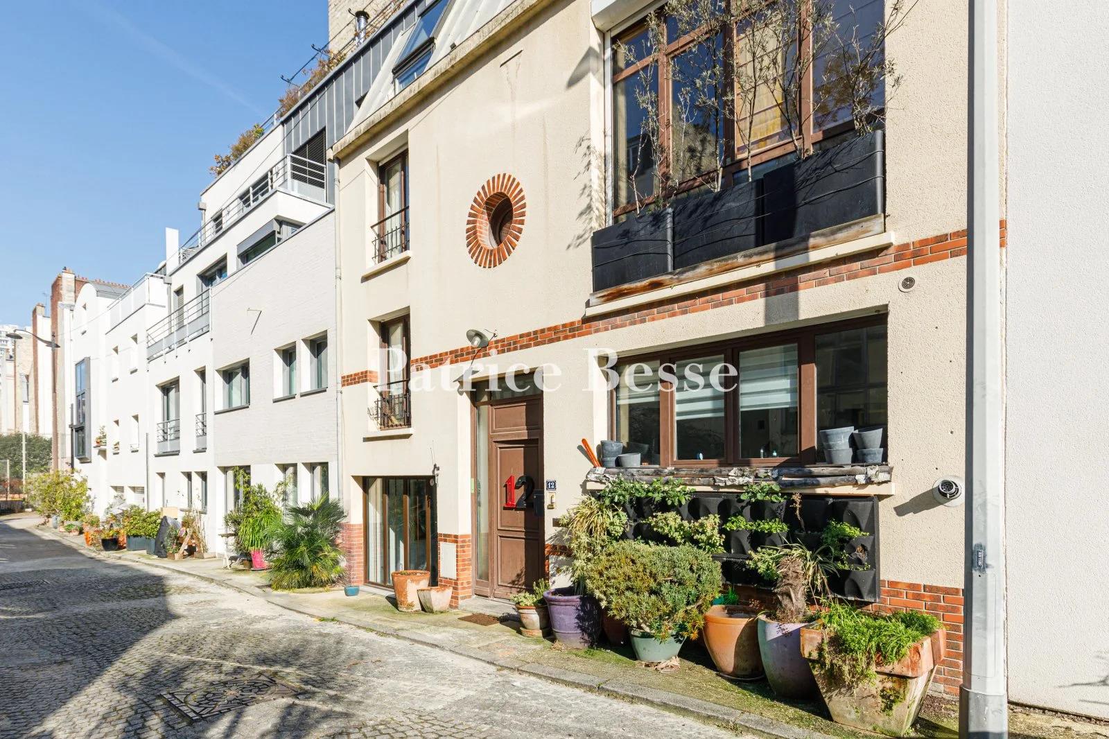 À Paris, dans le 14e arrondissement et le quartier de la rue Didot, une lumineuse maison de ville dans une ruelle calme et privée . La maison a été bâtie en 1995 avec l'esthétique d'une habitation ancienne, pour une superficie d'environ 160 m². Élevée de deux étages sur rez-de-chaussée, elle bénéficie d'une orientation plein sud et d'une luminosité constante grâce aux baies vitrées et à l'oeil-de-boeuf qui percent sa façade. Enduite de couleur crème et ornée de briques au niveau du soubassement, du bandeau filant qui surmonte la porte d'entrée et de l'entourage de l'oculus central, elle est asymétrique par ses baies droites aux divers formats, pleines de menuiseries à grands carreaux, et par ses trois travées aux largeurs variées. L'habitation dispose d'un sous-sol aménagé en un lieu de détente qui regroupe une salle de cinéma, un local technique, une cave à vin ainsi qu'une buanderie. Le rez-de-chaussée se compose d'une cuisine-salle à manger au plafond haut et d'un bureau qui donne sur la ruelle. Un étage intermédiaire abrite un espace de travail aisément transformable en chambre, où une salle de bains pourrait être installée sur le palier. Au premier étage, se tient une salle de séjour d'environ 30 m² avec une cheminée fonctionnelle et de grandes baies vitrées. Le plafond y atteint 3,6 m de hauteur. Un demi-étage, qui se trouve entre le salon et le deuxième étage, renferme la chambre principale, vaste, avec salle de douche. Enfin, le dernier niveau est occupé par deux chambres et une salle de bain.