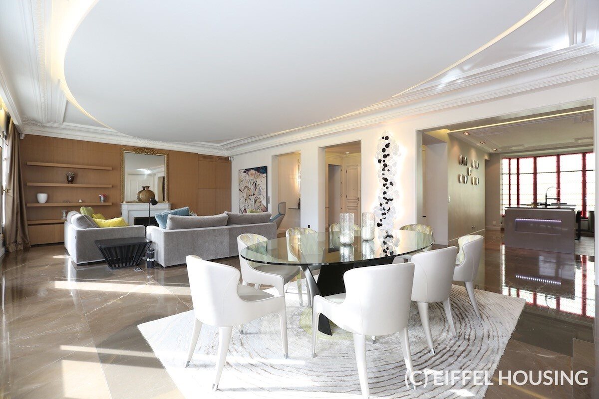 Somptueux appartement (duplex) meublé situé avenue Victor Hugo au coeur du 16ème arrondissement, à deux pas de l'Arc de Triomphe et des Chars-Elysées. Proximité des stations de métro Charles de Gaulle – Étoile (ligne 1, 2, 6 et A), Kléber (ligne 6) et Victor Hugo (ligne 6). Entièrement rénové par une architecte de renom. Aménagements et ameublement haut-de-gamme pour cet appartement intégralement climatisé et qui bénéficie d'un système complet de domotique (système son intégré, alarme). Situé au 5ème et 6ème étage (avec ascenseur), ce duplex de 250m2 comprend : Au premier niveau - 5ème étage: - une entrée, un grand double séjour (de 60m2) superbement meublé (orienté sud), baigné de lumière qui donne sur un balcon filant (vue sur l'Arc de Triomphe) - une grande cuisine haut de gamme (Gaggenau), entièrement équipée avec son ilot central - une suite parentale (22m2) avec son dressing et une immense salle de bain en marbre (baignoire et douche à l'italienne, cheminée à l'éthanol) - un Wc séparé - une seconde suite de 27m2 avec sa salle d'eau, Wc séparé, dressing Au second niveau - 6ème étage - une troisième chambre de 20m2 - une salle d'eau - un espace salon avec kitchenette - un Wc séparé Matériaux d'exception: parquet pointe de Hongrie, cheminée, marbre et albâtres. Prestations très haut de gamme. Climatisation réversible dans tout l'appartement. Nombreux rangements. Parties communes en parfait état. Gardien, digicode, interphone. Un bien d'exception!