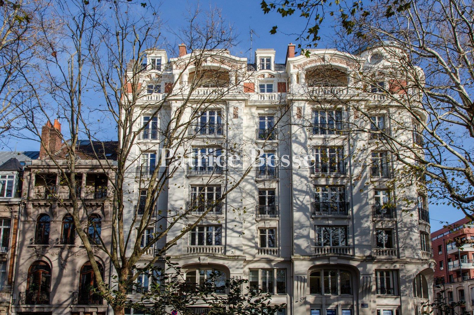 À Lille, dans un immeuble de style Art déco de 1925, un appartement situé au troisième étage, avec garage. L'appartement est établi au troisième étage d'un immeuble en pierre de 1925, situé boulevard de la Liberté, artère percée en 1860, qui faisait partie des aménagements d'urbanisme haussmannien sous le Second Empire. Aujourd'hui bordée de platanes, elle longe le Palais des Beaux-Arts, la Préfecture de Lille, et permet de rejoindre aisément le centre-ville. L'immeuble, conçu par l'architecte Charles Sarazin, élevé de sept niveaux, possède une façade d'inspiration Art déco, à la géométrie rigoureuse, qui se caractérise par une ligne sobre, gratifiée de motifs stylisés et de ferronneries d'art, où se mêlent le béton, la pierre et la brique. L'accès à la résidence s'effectue via un large portail vitré, équipé d'un interphone. Au fond de l'entrée, l'accès à la cour intérieure et aux caves se fait via un grand portail en fer forgé, d'inspiration Art déco. Sur la droite, le vestibule franchi, se dévoile l'ascenseur installé dans une cage métallique qui dessert les étages à l'exception du septième. L'immeuble se distingue par l'excellent état de ses parties communes. Une chambre de service de 14 m², située au septième étage, et deux caves en sous-sol, sont rattachées à l'appartement.