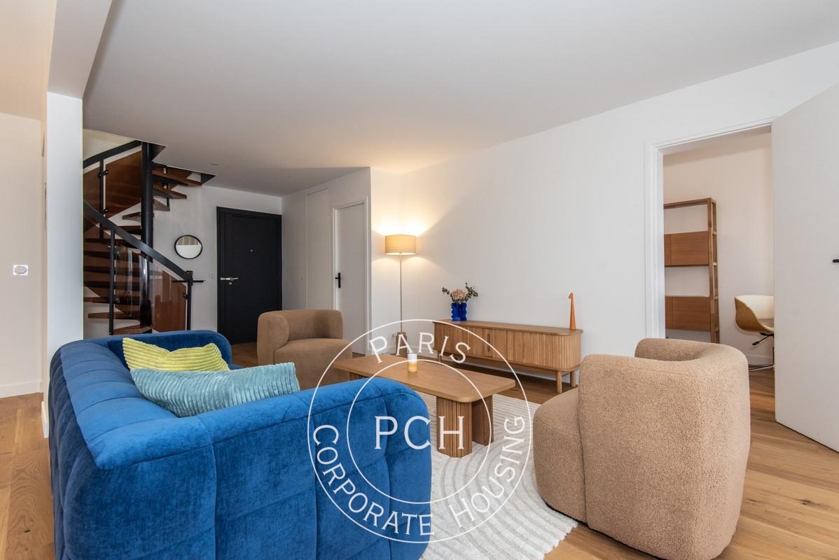 Paris Corporate Housing, services immobiliers pour entreprises et expatriés. Duplex meublé – Paris 17 €, rue Guersant Situé à deux pas de la station Ternes (ligne 2), ce duplex meublé de 127 m² environ, au 9 € étage avec ascenseur, offre une décoration élégante, deux balcons spacieux et des prestations récentes. Il comporte : - Un vaste séjour lumineux avec vue dégagée. - Deux balcons spacieux. - Une cuisine ouverte entièrement équipée, rénovée avec électroménager neuf. - Trois chambres. - Un bureau aménagé avec canapé-lit. - Une buanderie. - Deux salles d'eau rénovées. - Deux Wc. Le chauffage et l'eau chaude sont collectifs. Deux emplacements de parking sont disponibles en option (200 euros /mois). Zone soumise à encadrement des loyers : Données permettant de calculer l'encadrement du loyer en cours de vérification.== Pour voir d'autres biens de qualité, Rdv sur le site de Paris Corporate Housing==
