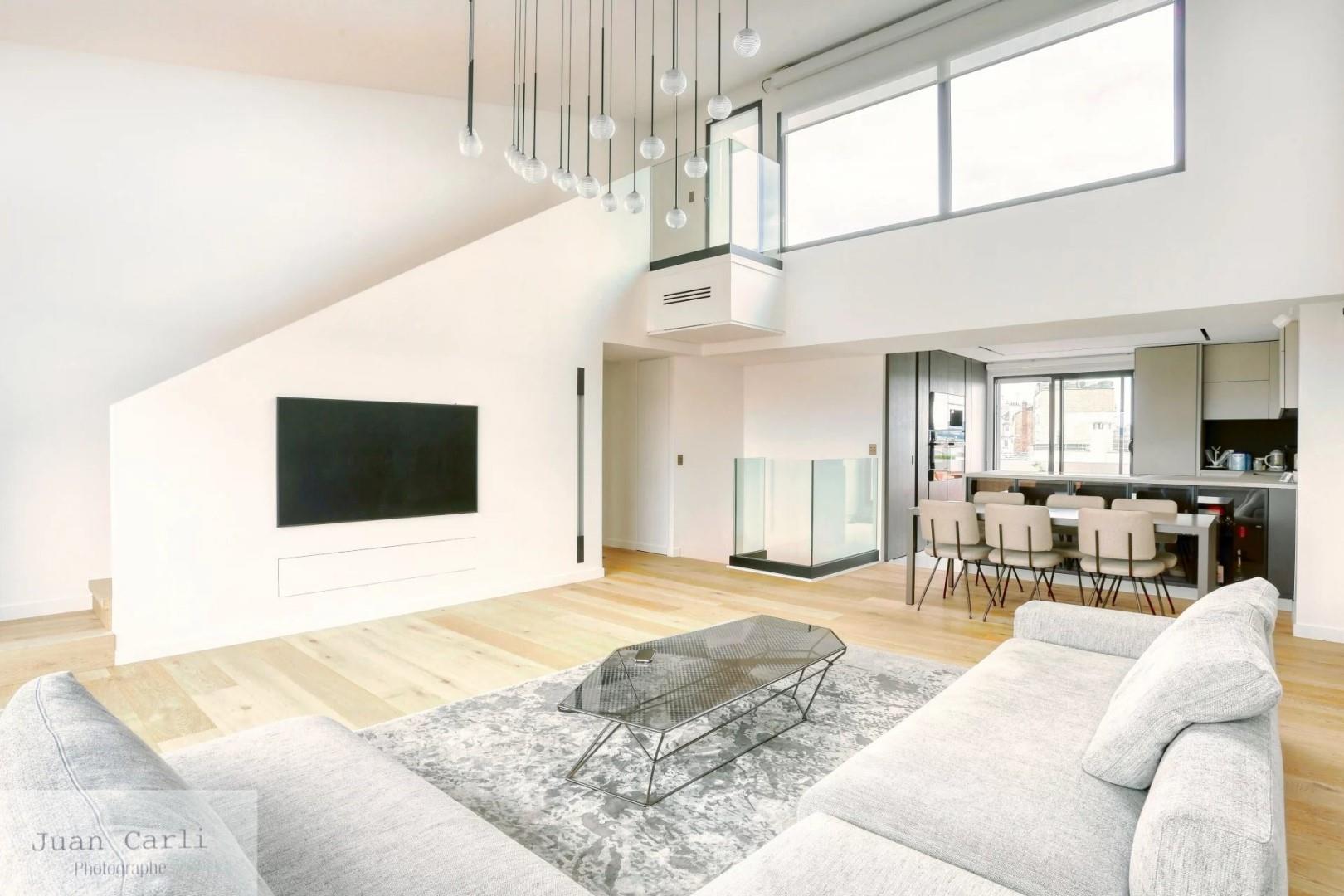 Boulogne – Rue André Malraux (derrière Robert-Schumann) Duplex d’exception 190 m² Terrasse 100 m² / Balcons 50 m² Rare et recherché. Au calme d’une adresse privilégiée, ce duplex de 190 m² séduit par sa très belle hauteur sous plafond, ses volumes de réception baignés de soleil et ses vues totalement dégagées – plein ciel. L’ensemble s’ouvre de plain-pied sur une magnifique terrasse de 100 m² prolongée par 50 m² de balcons. Réception : vaste séjour cathédrale avec baies sur terrasse, salle à manger, cuisine familiale ouverte Coté Nuit : 4 chambres dont suite parentale avec dressing et salle d’eau, 3 salles de bains/d’eau, buanderie. Terrasse plein soleil de 100 m²au toit ambiance rooftop, vues dégagées. Balcons filants totalisant 50 m² Annexes & atouts Studio de service indépendant en parfait état (idéal invité/ado/au pair/bureau). Deux emplacements de parking en sous-sol. Deux caves. Copropriété récente et soignée (gardien/ascenseur). Luminosité exceptionnelle – toutes pièces principales au calme, plein ciel.