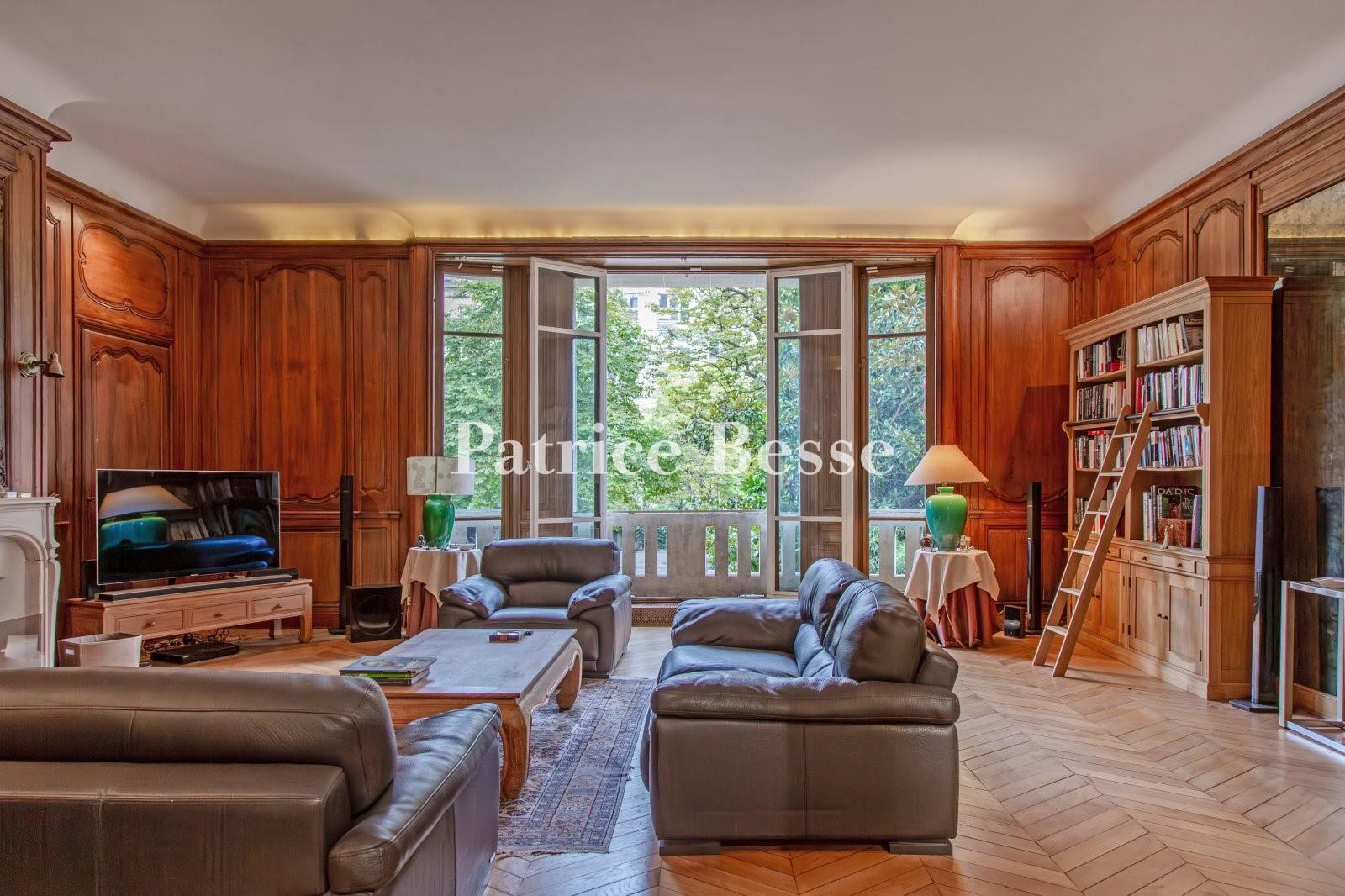 Dans un immeuble Art déco de l'avenue Henri-Martin, un appartement de 195 m² aux pièces de réception richement décorées. L'immeuble, situé du côté sud de l'avenue, est d'époque Art déco avec une façade en pierre de taille, ornée de sculptures, de mascarons et de balustres. Une grille en ferronnerie est sécurisée par un code qui en commande l'ouverture. Deux colonnes sculptées encadrent la double porte d'entrée vitrée, protégée par une ferronnerie ouvragée. Un digicode et un interphone protègent son accès. En outre, un gardien veille sur les parties communes de la copropriété, parfaitement entretenues. Un escalier et un ascenseur conduisent aux étages. Un deuxième ascenseur dessert l'escalier de service de l'immeuble. L'appartement, situé au premier étage avec une vue dégagée, est composé d'une grande entrée avec parquet marqueté aux motifs géométriques très élaborés, d'un salon, d'une salle à manger, de deux chambres (avec possibilité d'en créer une troisième), de deux salles de douche et d'une cuisine. Les pièces de réception totalisent une surface d'environ 100 m². La hauteur sous plafond est de 3,3 m. Parquet marqueté ou à points-de-Hongrie selon les salles, cheminées et lambris composent une décoration raffinée. Lumineux, l'appartement est traversant, exposé au sud et au nord-nord-ouest, et doté de beaux volumes. Une cave s'ajoute à l'habitation. Possibilité d'acquérir en sus un parking de 25 m² dans le même immeuble.