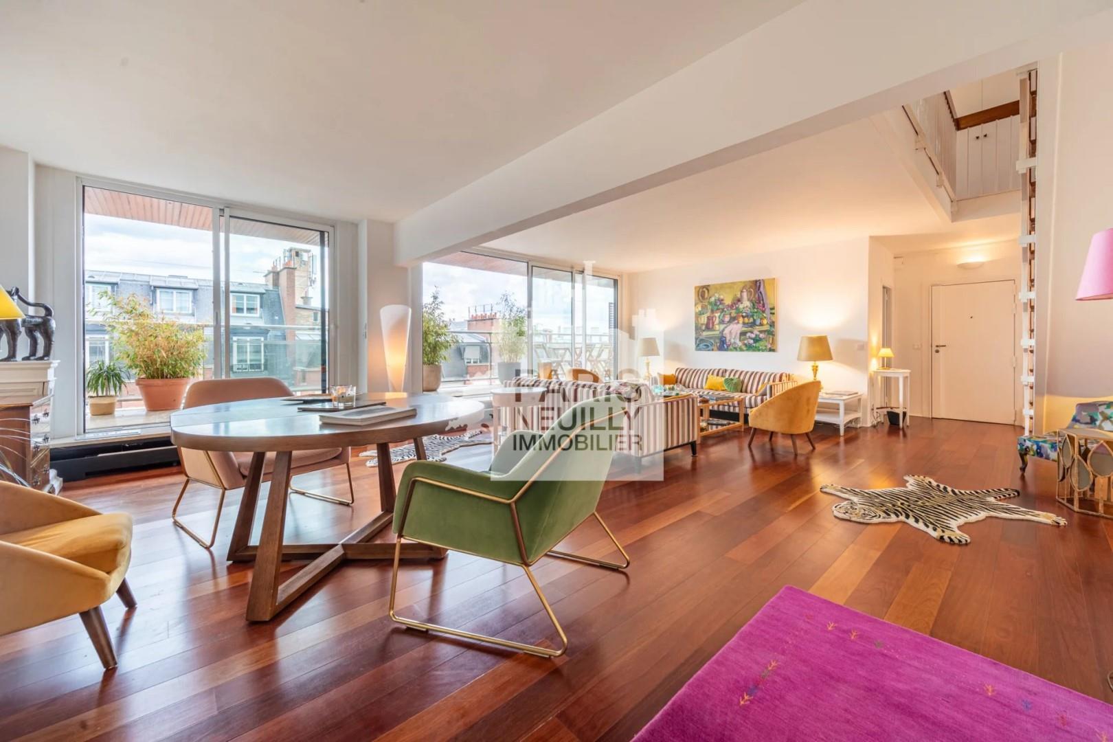 75016 - Rue Pierre Louys - Magnifique Duplex Meuble De 120M² Au 7ème étage d'un immeuble sécurisé, appartement de 120m² en duplex comprenant: un grand séjour donnant sur un balcon filant, une cuisine totalement équipée, une chambre parentale, deux chambres d'enfants dont une avec salle de douche et Wc attenant, une salle de bains avec baignoire, douche et WC. Un place de parking complète ce bien. Chauffage et eau chaude collectif. LUMINEUX - Vue Degagee - Nombreux Rangements - Sectorisation Jean Baptiste Say