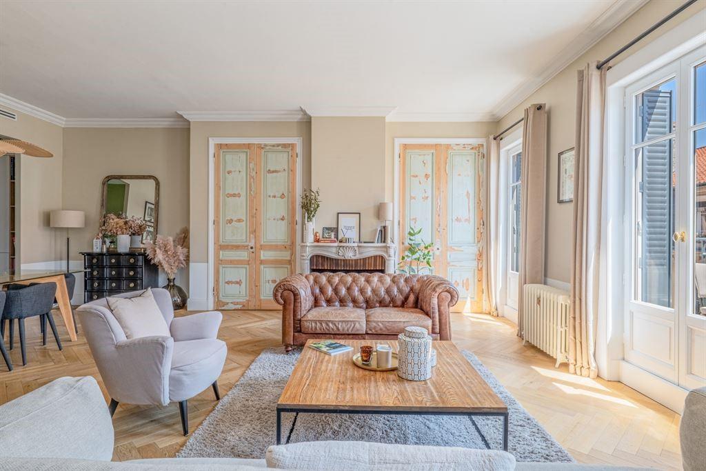 En exclusivité. Ce duplex traversant aux derniers étages d'un immeuble bourgeois ravalé distribue sur 161,79 m² habitables (112,48 m² carrez), un hall avec vestiaires, un beau séjour donnant sur un balcon filant exposé sud, une cuisine équipée semi ouverte, une vaste suite parentale avec rangements, salle de bain et wc, deux chambres, une salle de bain avec douche, baignoire, une double vasque et un wc, un wc invités avec coin pour les machines est également présent au premier niveau. L'appartement, entièrement rénové avec élégance et qualité dans les matériaux et les finitions, bénéficie d'une climatisation intégrée et intégrale. L'immeuble est sur son terrain et est excellement bien placé entre Saint-Pothin et le Rhône, au calme mais à proximité de toutes les commodités. Deux caves complètent le lot principal.