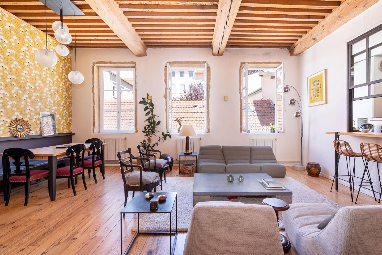 En plein coeur de la Croix-Rousse, sur la rue du Mail, cet appartement s'apparente à une véritable maison de ville.Il développe 148 m² utiles (125 m² Carrez) répartis sur trois niveaux, au calme absolu : Niveau 1 : trois chambres avec rangements, salle d'eau. Niveau 2 : un vaste séjour lumineux avec vue dégagée, cuisine semi-ouverte et nombreux rangements. Dernier niveau : une charmante suite parentale, avec la possibilité d'y installer une climatisation.Le tout dans un cocon mêlant le cachet de l'ancien et une rénovation contemporaine, à deux pas de l'animation du quartier.Une cave complète le bien. Un stationnement est disponible en sus.