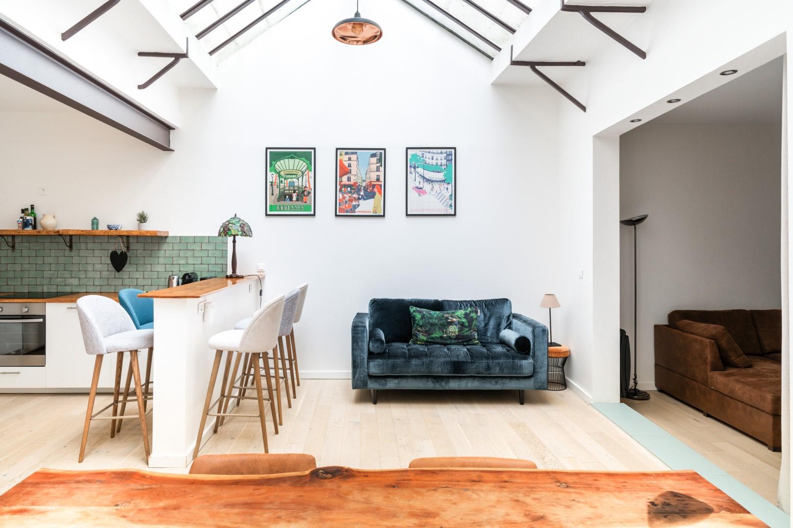 Quartier Montorgueil - Sentier : Situé dans un charmant immeuble 1860, cet appartement de 96,46 m2 est composé d’une entrée privative , un vaste double séjour avec une splendide verrière, cuisine ouverte équipée, salon télé, deux chambres (possibilité 3), une salle d’eau et wc. Appartement traversant sur rue calme, à deux pas de la rue des petits carreaux et de ses commerces.