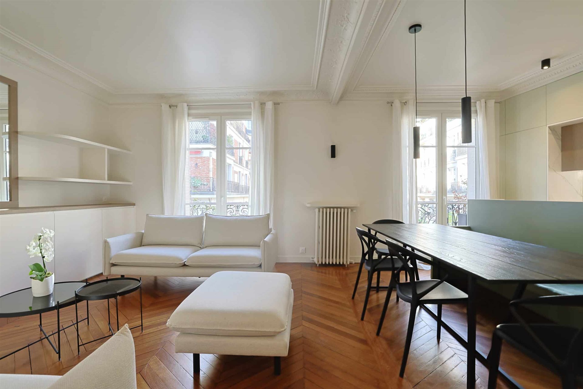 Superbe appartement entièrement rénové, meublé et équipé par une architecte, situé rue des Marronniers, à proximité de la rue de Passy, du métro La Muette (ligne 9) et du Rer Boulainvilliers (ligne C). Situé au 5ème étage avec ascenseur dans un immeuble haussmannien de standing, il se compose de : Une entrée Un double séjour avec balcon filant Une cuisine ouverte Deux chambres en enfilade Une chambre d’enfant / bureau Une salle de bain Un Wc séparé Nombreux rangements intégrés. Chauffage et eau chaude individuels. Dépôt de garantie: 2 mois de loyers hors charges BAIL Code Civil Uniquement (bail société, résidence secondaire ou logement lié à l’exercice d’une fonction), les honoraires d’agence sont de 12% Ttc du loyer annuel hors charges.