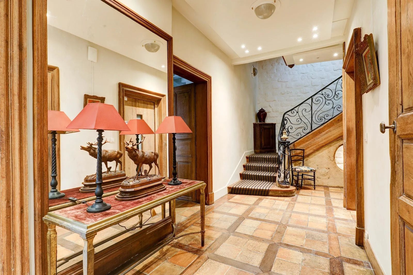 Au cœur du Marais, à proximité de la place des Vosges, dans une impasse à l'abri des regards, une maison au charme exceptionnelle, sur 5 niveaux avec ascenseur, cachée au fond d'une cour pavée, arborée et fleurie abritant une jolie fontaine et une véranda (salle à manger d'été). Elle comprend : Au rez-de-chaussée : Une galerie d'entrée avec une magnifique envolée d'escalier, un vestiaire d'invités et lave-mains, une salle à manger avec boiserie et cheminée, un grand salon et son boudoir, un grand office et une cuisine, une chambre avec balcon donnant sur le jardin, dressing et salle de bains avec WC. Au premier étage: Une grande pièce palière, Une chambre de Maître avec dressing et salle de bains (douche et baignoire), une seconde chambre avec cheminée, boiserie, un dressing et une salle de bains. Au deuxième étage : Une grande pièce palière, une grande suite parentale avec petit salon, un dressing et une salle de bains, une seconde chambre avec dressing et salle de bains. Au 1er sous-sol : Une belle piscine chauffée de 30m², un sauna, une salle de sport, une salle d'eau avec Wc, une chambre avec salle de bains et une buanderie. Au 2ème sous-sol Toute la machinerie. A l'extérieur de la maison une dépendance de 30 m² comprenant une chambre avec dressing salle bains et WC. Possibilité d'un emplacement de parking à proximité