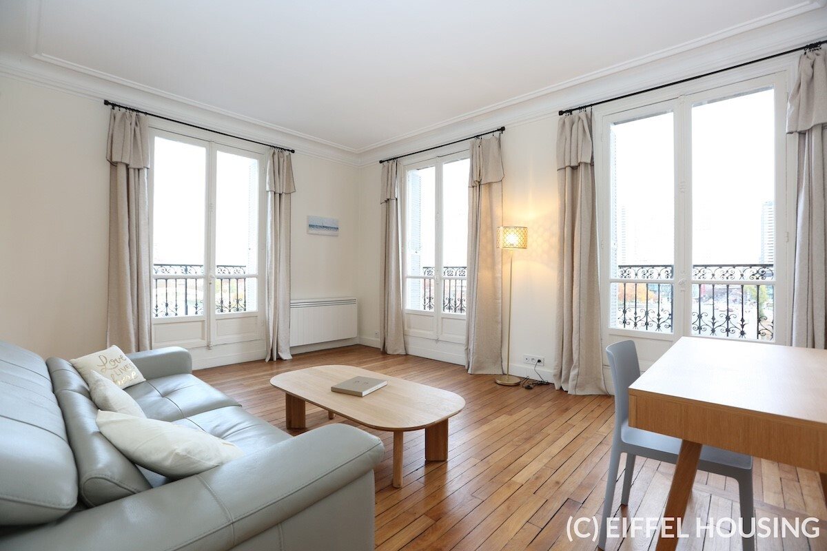 Très bel appartement meublé situé rue Maurice Bourdet dans le 16ème arrondissement, au pied du pont de Grenelle, en face du centre commercial Beaugrenelle et à coté de la Maison de la Radio. Au pied de la station de métro Maison de la Radio. Proche des stations de métro Maison de la Radio (Rer C), Jasmin (ligne 9) et Charles Michel (ligne 10). Appartement d’angle avec vue sur la Seine et la Tour Eiffel. L’Appartement est en excellent état et baigné de lumière. Ameublement neuf et contemporain. Au 5ème étage (avec ascenseur), cet appartement de 85m2 comprend : un salon d’angle (orienté sud-est avec vue sur la Seine et la Tour Eiffel) une grande salle à manger avec sa cuisine américaine toute équipée (avec ilot central) (35m2 environ) 2 chambres (respectivement 12 et 11m2) une salle de douche avec WC Balcon filant de 15m2. Double vitrage. Chauffage et eau chaude individuels électriques. Digicode, interphone.