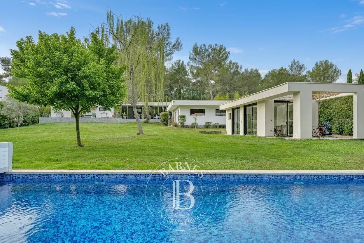 Aux portes de Montpellier, au sein d'un secteur résidentiel recherché de Saint-Gély-du-Fesc, cette villa contemporaine de plain-pied dévoile un cadre de vie exceptionnel, en parfaite harmonie avec la pinède qui la borde. Développant près de 300 m², la propriété se distingue par son architecture épurée et ses volumes généreux, entièrement tournés vers un jardin paysager magnifiquement structuré. Les larges baies vitrées offrent une luminosité constante et prolongent chaque espace vers les terrasses, la piscine et les lieux de détente extérieurs. La pièce de vie centrale, spacieuse et élégante, réunit un salon chaleureux, une salle à manger et une cuisine parfaitement équipée, complétée par une arrière-cuisine discrète. La suite parentale constitue un véritable sanctuaire : vaste chambre ouverte sur le jardin, dressing sur-mesure et bureau offrant une atmosphère intime et raffinée. L'aile dédiée à la famille et aux invités propose trois chambres supplémentaires, dont une suite, ainsi qu'une salle d'eau contemporaine, garantissant confort et indépendance. Une dépendance autonome, idéale pour recevoir ou exercer une activité professionnelle, enrichit les possibilités d'usage de la propriété. En lisière immédiate de la forêt, la piscine et son pool-house doté d'une cuisine créent une ambiance de villégiature rare, propice à la détente et à la convivialité. Les prestations complètent un niveau d'exigence élevé : forage, panneaux solaires, carport double et accès direct à la pinède. Une adresse de charme, mêlant naturel et modernité, à seulement quelques minutes du centre de Montpellier.