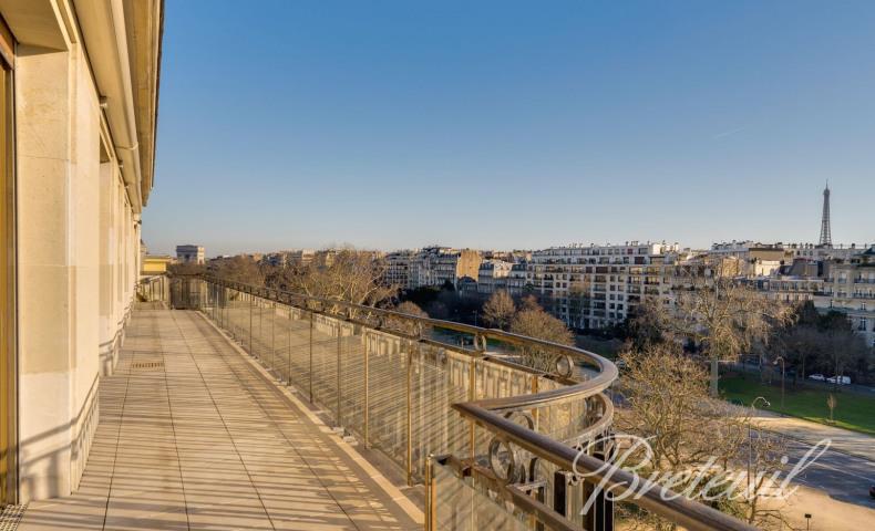 Immeuble 1950 de très haut standing, magnifique appartement de réception, non-meublé, de 342 m², au sixième étage desservi par ascenseur. La galerie d'entrée mène à un salon avec une terrasse donnant sur l'avenue Foch (vues tour Eiffel, arc de Triomphe, bois ...
