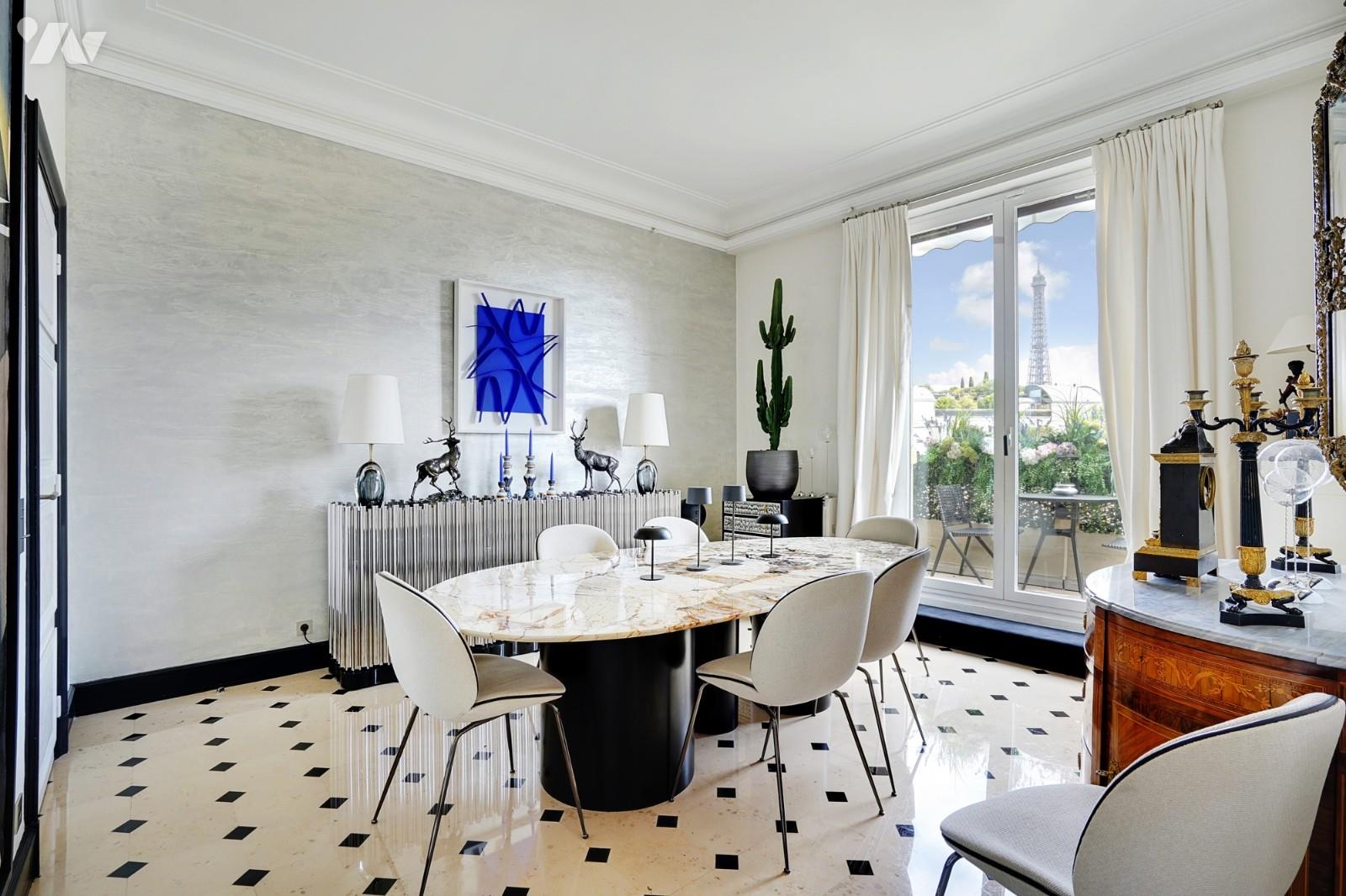 Paris 16ème/Victor Hugo. Au calme, Penthouse traversant entièrement rénové par un architecte avec terrasses sans vis à vis de 120 m². Entrée, séjour de plain pied sur une première terrasse de 26 m², cuisine semi américaine équipée, salle à manger, suite parentale avec dressing et salle de bains, deux autres chambres avec chacune leur salle d'eau. Matériaux haut de gamme. Appartement entièrement climatisé. Toit terrasse de 96 m². 1 cave. 1 Parking en sus. Honoraires à charge vendeur inclus dans le prix de vente. Montant moyen annuel de la quote-part de charges courantes : 8.400 € Nombre de lots : 82 - Aucune procédure en cours menée sur le fondement des articles 29-1 A et 29-1 de la loi n° 65-557 du 10 juillet 1965 et de l'article L.615-6 du CCH. Énergie - Montant bas estimé des dépenses annuelles pour un usage standard : 748.16 €/an, Année de référence des prix de l'énergie : 2021 Les informations sur les risques auxquels ce bien est exposé sont disponibles sur le site Géorisques Mandat n° 19980.