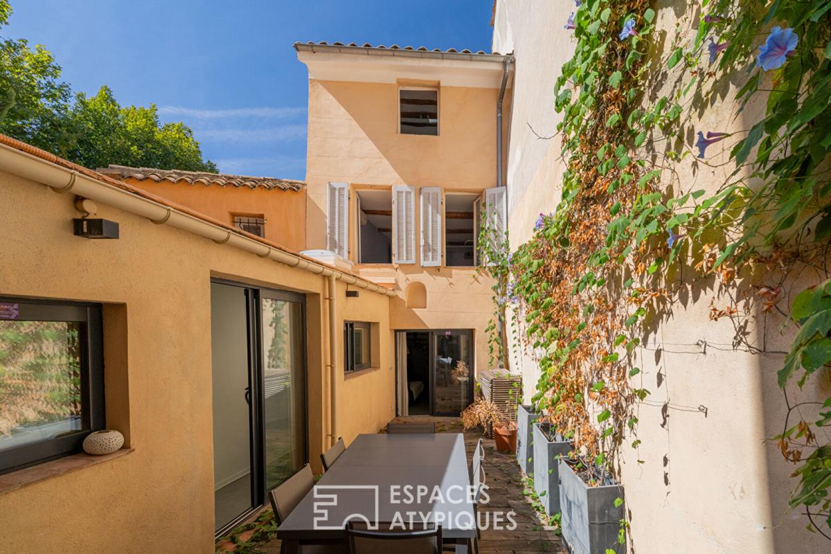 Au coeur d'Aix-en-Provence, dans un quartier en pleine réhabilitation, se niche un appartement en triplex aux allures de maison de ville. Situé au sein d'un immeuble restauré en 2011, ce bien développe 86 m² et s'intègre parfaitement au style architectural de la cité tout en alliant un intérieur résolument contemporain. L'entrée de l'appartement se fait par une cuisine indépendante, aménagée et équipée, qui s'ouvre sur la terrasse. Les pièces de vie s'articulent autour de cet espace extérieur. Un couloir dessert le salon, invitant à la détente avec son parquet chaleureux et son ambiance feutrée. Cette pièce s'ouvre elle aussi directement sur la cour privative, renforçant la fluidité entre l'intérieur et l'extérieur. Les volumes atypiques, mis en valeur par des poutres apparentes, confèrent à l'ensemble un cachet unique. Les deux chambres se situent aux étages supérieurs, offrant un cadre propice au repos. Chacune bénéficie de la climatisation, et l'une dispose d'un dressing, l'autre de rangements. Une salle de bains et une salle de douche complètent les prestations, situées à mi-chemin entre les deux chambres. Le bien dispose également d'une grande cave de 15 m², aménagée et saine, directement accessible depuis l'entrée. Tel un havre de paix, l'appartement se prolonge à l'extérieur par une cour privative baignée de lumière. Cette terrasse en bois, véritable extension du salon et de la cuisine, est un lieu d'exception pour les repas en plein air ou les moments de quiétude, loin de l'agitation de la ville. Les plantes grimpantes qui l'habillent ajoutent une touche de verdure, ce qui crée une atmosphère singulière et un sentiment de dépaysement. Le calme de cette cour en fait un atout majeur et une véritable rareté dans cet environnement urbain. Ce bien rare allie les qualités d'un appartement de standing et le charme d'une maison individuelle. Son style contemporain et ses volumes atypiques le positionnent comme une belle opportunité sur le marché immobilier aixois, susceptible de déclencher un véritable coup de coeur. Classe Energie : D / Classe Climat : B. Montant estimé des dépenses annuelles d'énergie pour un usage standard, établi à partir des prix de l'énergie de l'année 2021 : entre 1080€ et 1520€ par an. Copropriété de 10 lots - dont 10 lots habitation. (Pas de procédure en cours). Charges annuelles : 1800.00 euros. Afficher le téléphone