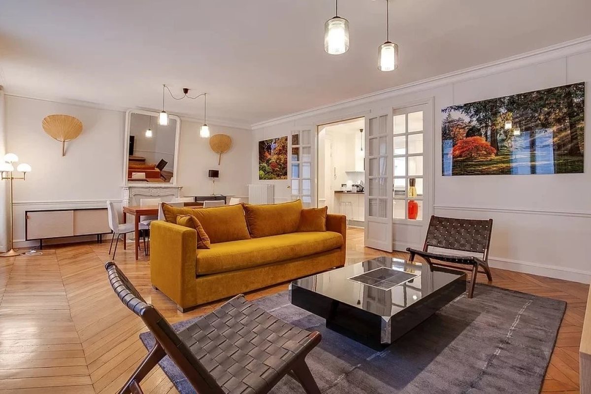 Place Mexico - Trocadéro 75116 - Au 4ème étage avec ascenseur d'un immeuble pierre de taille 1900, un bel appartement meublé de 4 pièces - 2 chambres entièrement refait à neuf. Parquet en point de Hongrie, moulures et cheminée. Cuisine américaine entièrement équipée, salle de bains moderne, double vitrage partout. Le loyer comprend, internet, alarme, coffre et une heure de ménage par semaine. le Afficher le téléphone