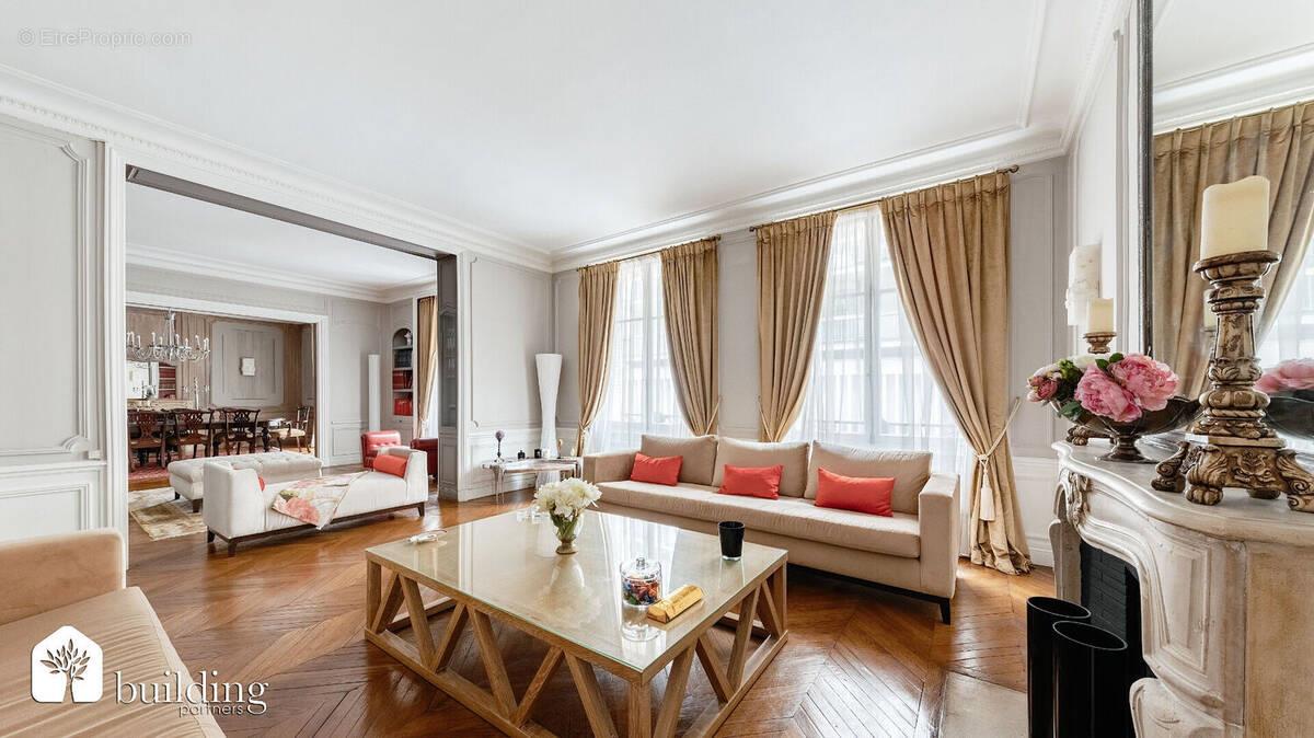 A vendre à Paris 16e, dans le prestigieux quartier du Trocadéro, superbe appartement de réception en angle de 241,98 m² "Carrez", situé en étage d'un immeuble ancien de très belle facture avec gardienne à demeure. Ce bien d'exception séduit dès l'entrée par ses volumes remarquables et son élégance classique. Il comprend une triple réception lumineuse offrant de magnifiques perspectives et de belles vues dégagées, un Wc invité, ainsi qu'une cuisine dinatoire indépendante, idéale pour une vie familiale ou pour recevoir. La partie nuit est composée d'une splendide chambre parentale en rotonde avec sa salle de bains privative, de trois autres chambres confortables, chacune avec salle d'eau et Wc. Vous retrouverez tout le charme de l'ancien : parquet d'origine, moulures raffinées, cheminées, ainsi qu'une grande hauteur sous plafond de 3,30 mètres, renforçant la sensation d'espace et d'élégance. Une cave complète ce bien. L'appartement bénéficie d'une sectorisation scolaire très recherchée : Janson de Sailly. Ce bien rare à la vente séduira les amateurs de beaux volumes et d'élégance classique, à la recherche d'un cadre de vie privilégié dans l'un des quartiers les plus prisés de la capitale. N'hésitez pas à nous pour plus d'informations ou organiser une visite. Depuis 1993, Building Partners accompagne les propriétaires dans la vente de biens immobiliers de standing sur l'ouest parisien. Notre force ? Une organisation unique avec deux rôles experts : Les Brokers, spécialisés dans la prospection et la valorisation de votre bien. Les Sellers, experts en négociation et en mise en relation avec notre portefeuille d'acheteurs qualifiés. Avec 5 agences implantées au coeur des quartiers les plus recherchés (Paris 16e, Paris 17e, Neuilly, Levallois, Courbevoie), nous vous offrons une visibilité maximale, un accompagnement personnalisé et un engagement total jusqu'à la signature. Confiez-Nous votre bien pour une vente rapide, au meilleur prix. Estimation offerte, confidentielle et sans engagement. Copropriété de 13 lots (Pas de procédure en cours). Charges annuelles : 10560 euros.