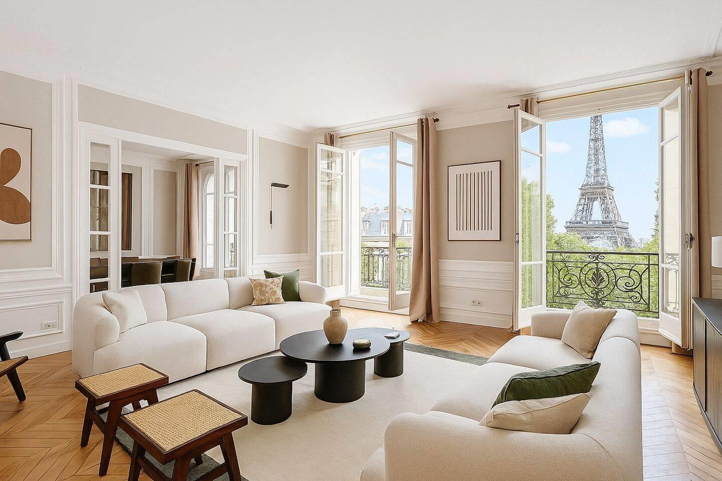 A deux pas de la Tour Eiffel, et du Champ de Mars, Dreyfus-Schmidt vous propose en exclusivité un splendide appartement de 250m² au 5e étage avec ascenseur. Il se compose d'une galerie d'entrée, une triple réception avec vue Tour Eiffel, une cuisine séparée, 4 chambres avec salle de bains en suite, dressing, 3 Wc. Bail code civil uniquement. Honoraires agence: 12% du loyer annuel Ht