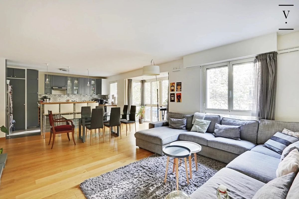 Voltaire. - Charonne Voltaire/Charonne. Villaret Immobilier vous propose, dans un quartier agréable et commerçant au sein d'un immeuble récent, ce bel appartement familial de 107m2 Loi Carrez bénéficiant d'un espace extérieur de 7 m2 sur une cour calme et arborée, exposé plein Sud. L'appartement est disposé de la manière suivante : entrée avec rangements, vaste pièce de vie de 44m2 avec cuisine ouverte aménagée, équipée et îlot, de 2 chambres desservant l'espace extérieur, une 3ème chambre, une grande salle d'eau avec baignoire, douche avec Wc et second Wc indépendants. Une cave complète ce bien et une place de parking est possible en sus du prix. Gardien et local à vélos.