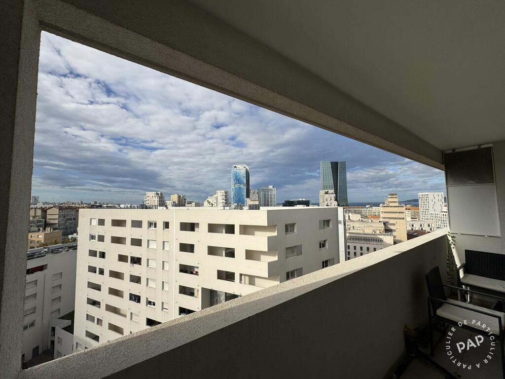 T4 traversant de 71 m² au 12ᵉ étage (avec ascenseur) d’une résidence récente et sécurisée (2015) située Les Docks Libres, au pied du métro National et à 5 min à pied du tram. L’Appartement se compose de : Séjour lumineux exposé sud-ouest avec accès à une terrasse de 10 m² offrant une vue panoramique sur Notre-Dame de la Garde, la mer et les monuments de Marseille. Cuisine équipée ouverte sur le séjour (plaque induction, hotte, rangements). 3 chambres : Suite parentale avec salle d’eau privative de 14m² Chambre de 12 m² Chambre de 9 m² avec dressing intégré Salle de bain avec baignoire, vasque et wc. Nombreux rangements (dressing + penderies). Climatisation réversible, double vitrage, fibre optique. Prestations incluses dans les charges (350 €/mois) : chauffage gaz collectif, eau chaude, eau froide, entretien parties communes. Loyer Hc : 850 € / mois Dépôt de garantie : 850 € Disponible le 1er septembre – Bail 3 ans (vide) – Animaux acceptés – Place de parking privative incluse.
