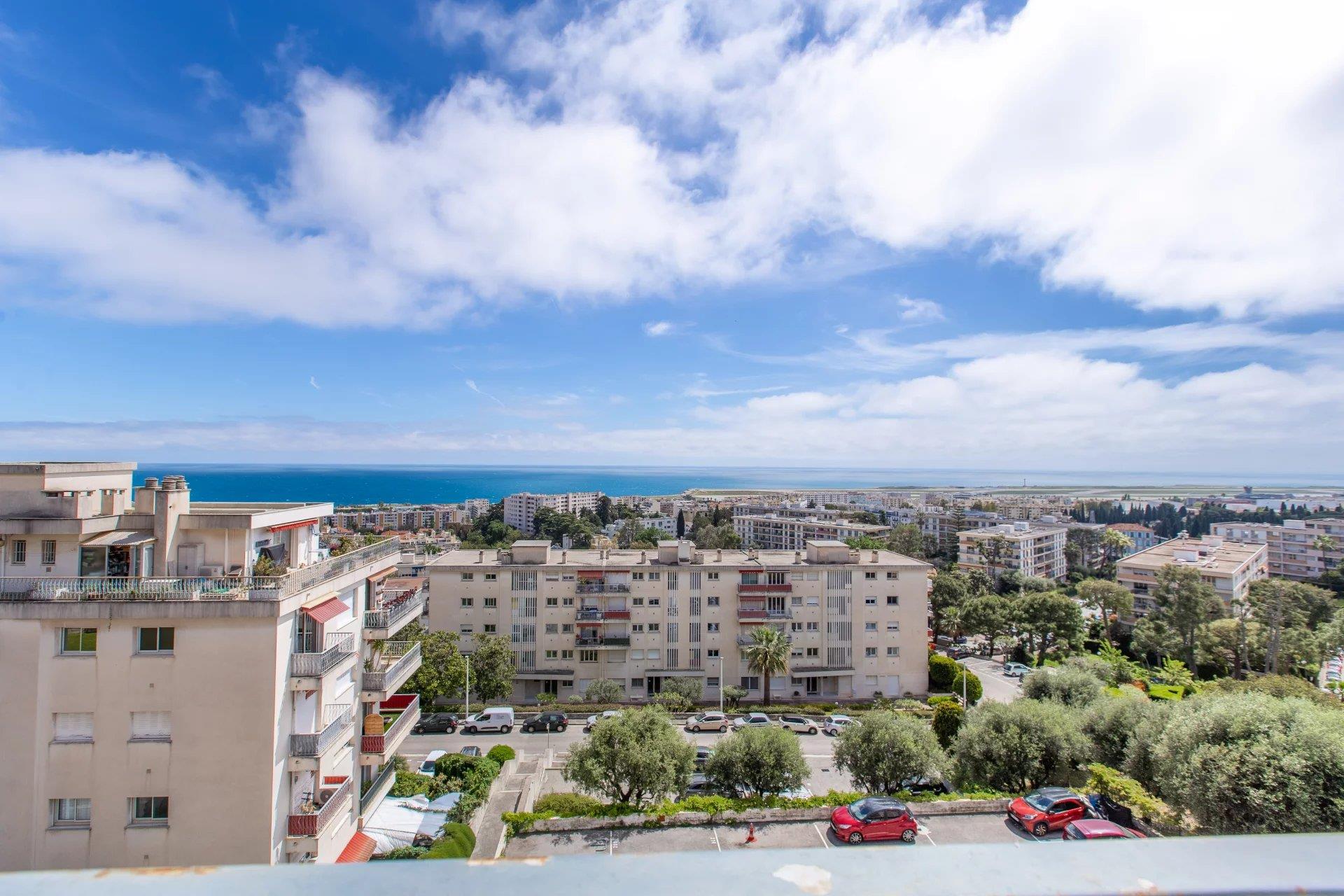 Nice Ouest / Fabron Napoleon Iii : Situé dans le plus haut bâtiment du Domaine des Fleurs, les Edelweiss, en dernier étage, magnifique 4 pièces de 103 m² entièrement rénové et climatisé, traversant Sud-Nord, avec une grande terrasse offrant une splendide vue mer panoramique. L'appartement se compose d'une entrée, séjour double, cuisine indépendante et cellier, 3 chambres, deux salles de douche, Wc invités. Deux caves inclus. Un parking couvert en sus 40000€. Très calme, cet appartement conviendra parfaitement à une famille. Honoraires de 5% inclus à la charge du vendeur. Les informations sur les risques auxquels ce bien est exposé sont disponibles sur le site Géorisques :