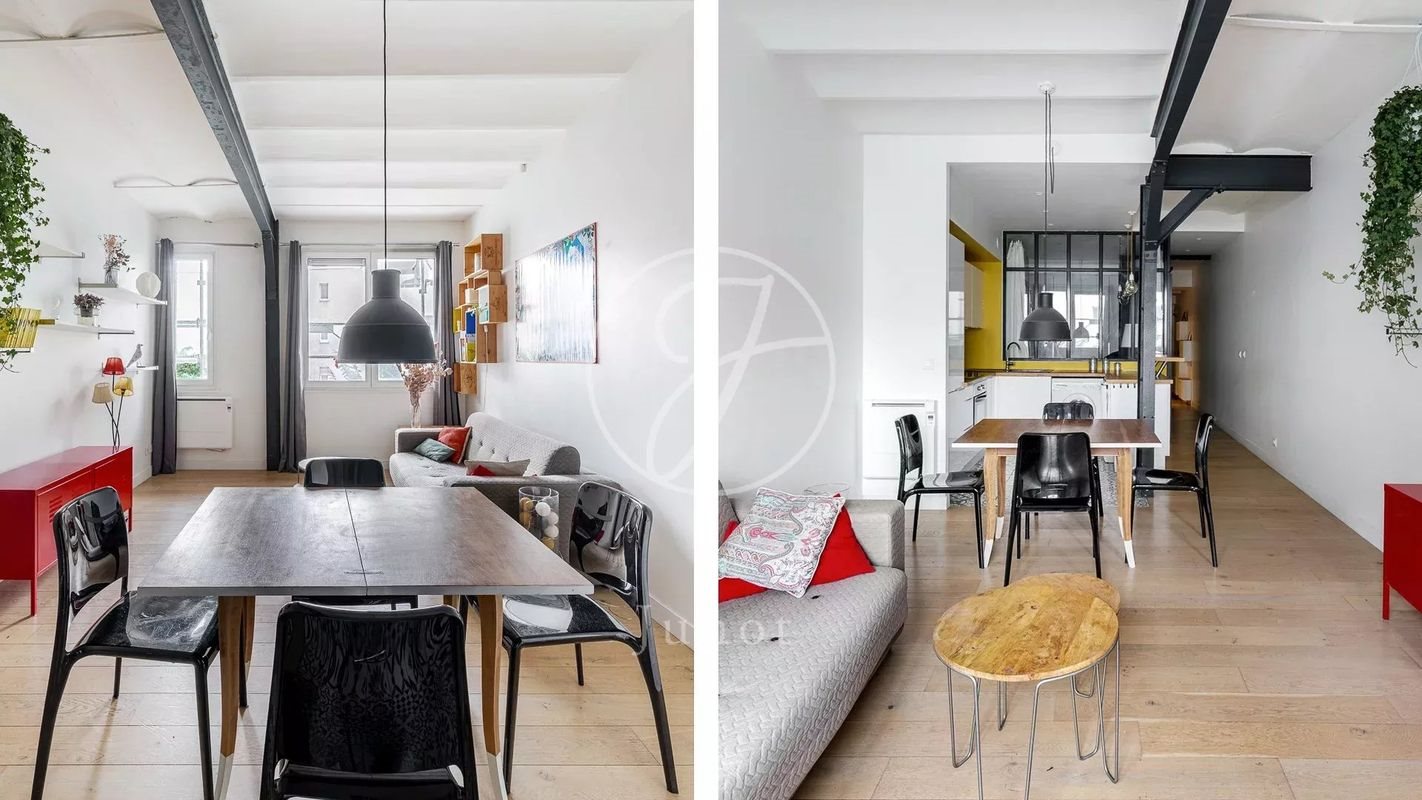 Paris 11e - Belleville / Oberkampf - Loft à vendre - 2 pièces - 47,92m² Carrez. Au cœur du quartier Belleville, à proximité de la rue Oberkampf, superbe loft au format deux pièces, au deuxième étage par ascenseur, dans un immeuble à la structure type Eiffel. Il comporte une très belle pièce de vie de 26,38m², une cuisine ouverte équipée, une chambre avec rangement et une salle de bain avec toilettes. Vous serez séduit par cet appartement au charme atypique, exposé sud-ouest, en très bon état.