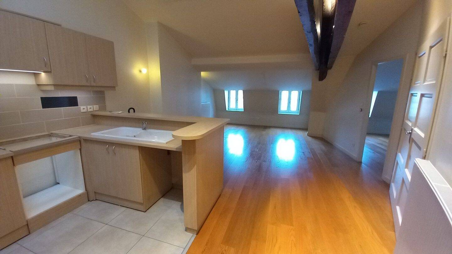 Proche place de la République, T2 en dernier étage avec ascenseur, grand séjour avec cuisine américaine meublée non équipée, une grande chambre avec dressing, une salle de bains et un Wc avec lave-mains, nombreux rangements