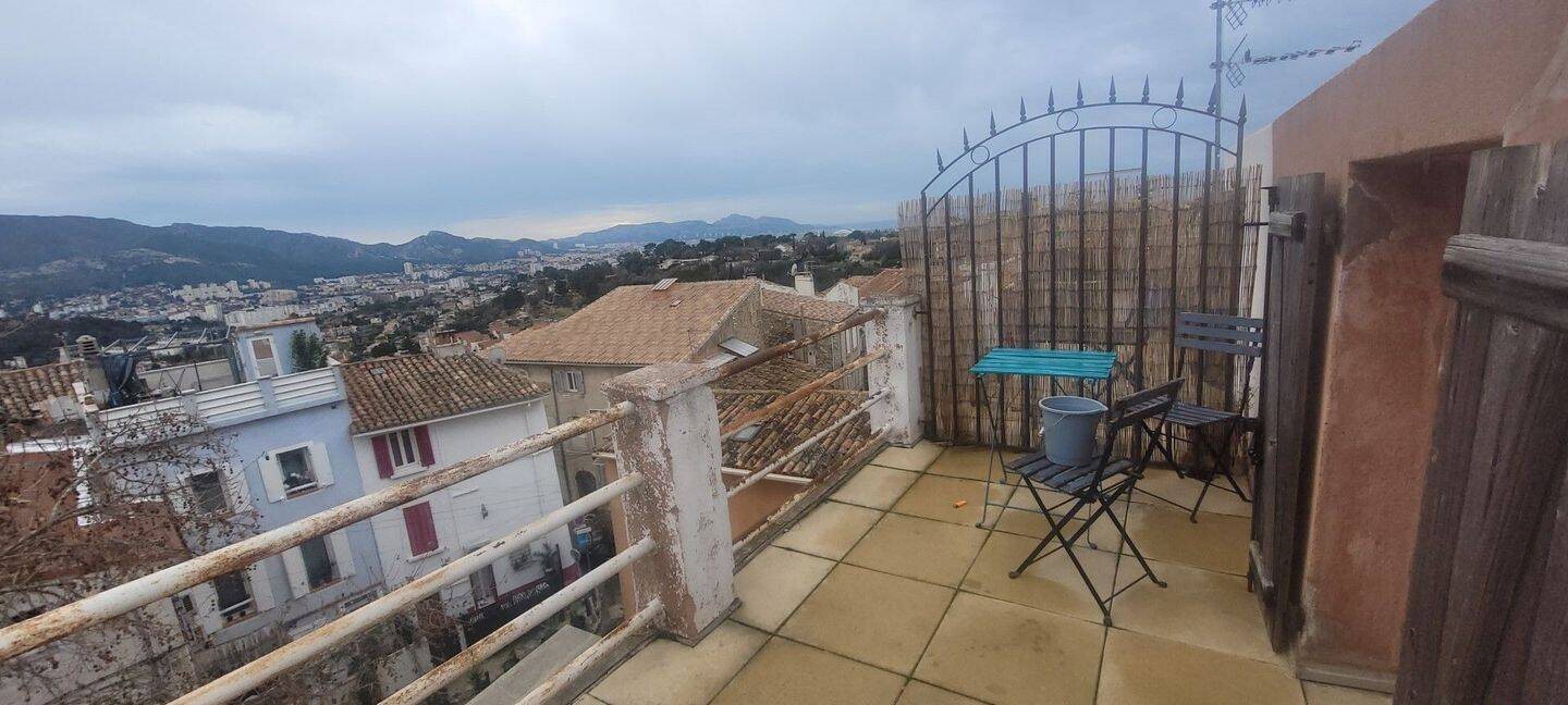 Dans petit immeuble ancien, type 1/2 duplex comprenant une pièce à vivre avec cuisine ouvrant sur une terrasse, une salle d'eau avec w.c., un grand placard, une mezzanine avec poutres apparentes ouvrant sur une deuxième terrasse, jouissant d'une vue panoramique s...