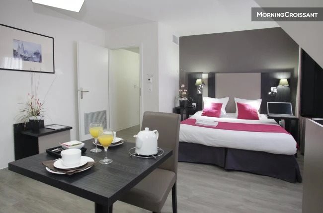 Studio meublé, équipé d'une salle de bain avec sèche-serviettes et Wc, d'une kitchenette comprenant micro-ondes, plaque électrique, réfrigérateur, petit lave-vaisselle et d'une table + 2 chaises Dans le centre strasbourgeois, l'établissement se trouve derrière la Place des Halles. Vous y retrouverez plus d'une centaine de boutiques. Il sera pratique de visiter la ville avec à seulement deux pas une station de tramway « Faubourg de Saverne ». À votre disposition : - Parking couvert (avec participation) - Espace bien-être avec piscine (uniquement sur privatisation et réservation à l'avance) Dans le cadre d'une location saisonnière, en plus du loyer mensuel, une taxe de séjour d'un montant qui varie par nuit et par personne, sera à régler directement auprès de la résidence.