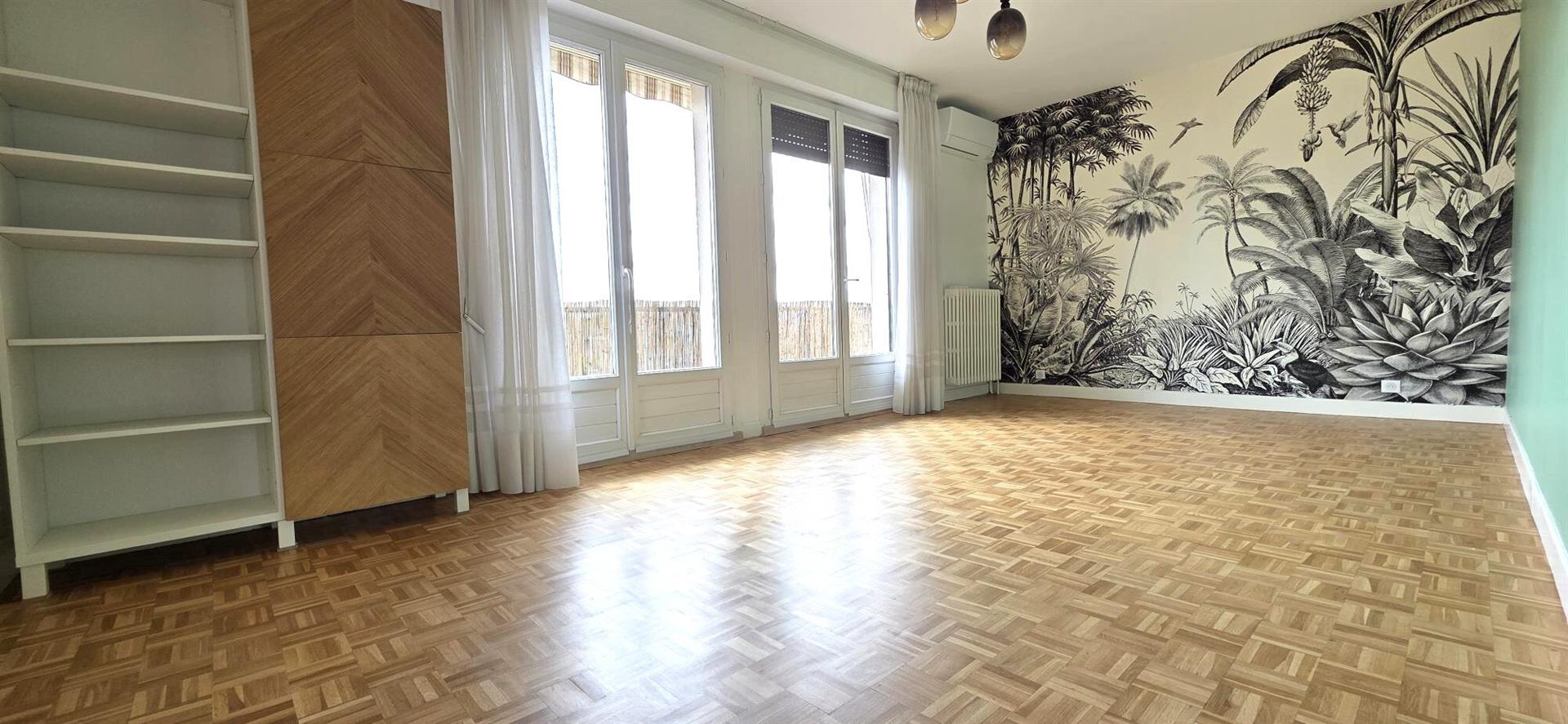 Saint-Michel dans rue calme avec vue dégagée sur verdure T3 de 83 m2 traversant Est-Ouest climatisé en 4ème étage sans ascenseur, refait à neuf une entrée, séjour avec panoramique donnant sur balcon filant avec stores-bannes, cuisine intégrée neuve (meubles hauts et bas, plaque gaz 4 feux, hotte, four lave-vaisselle avec cellier attenant pourvu détagères et d'un branchement machine à laver), un dégaement avec placard équipés desservant 2 chambres avec rangements, une salle de bain avec un placard et 2 vasques sur meuble, un Wc suspendu. Cet appartement bénéficie également d'un chauffage individuel au gaz, d'un local vélo collectif, d'une cave privative et d'un parking couvert en rez-de-chaussée de l'immeuble pour une voiture.