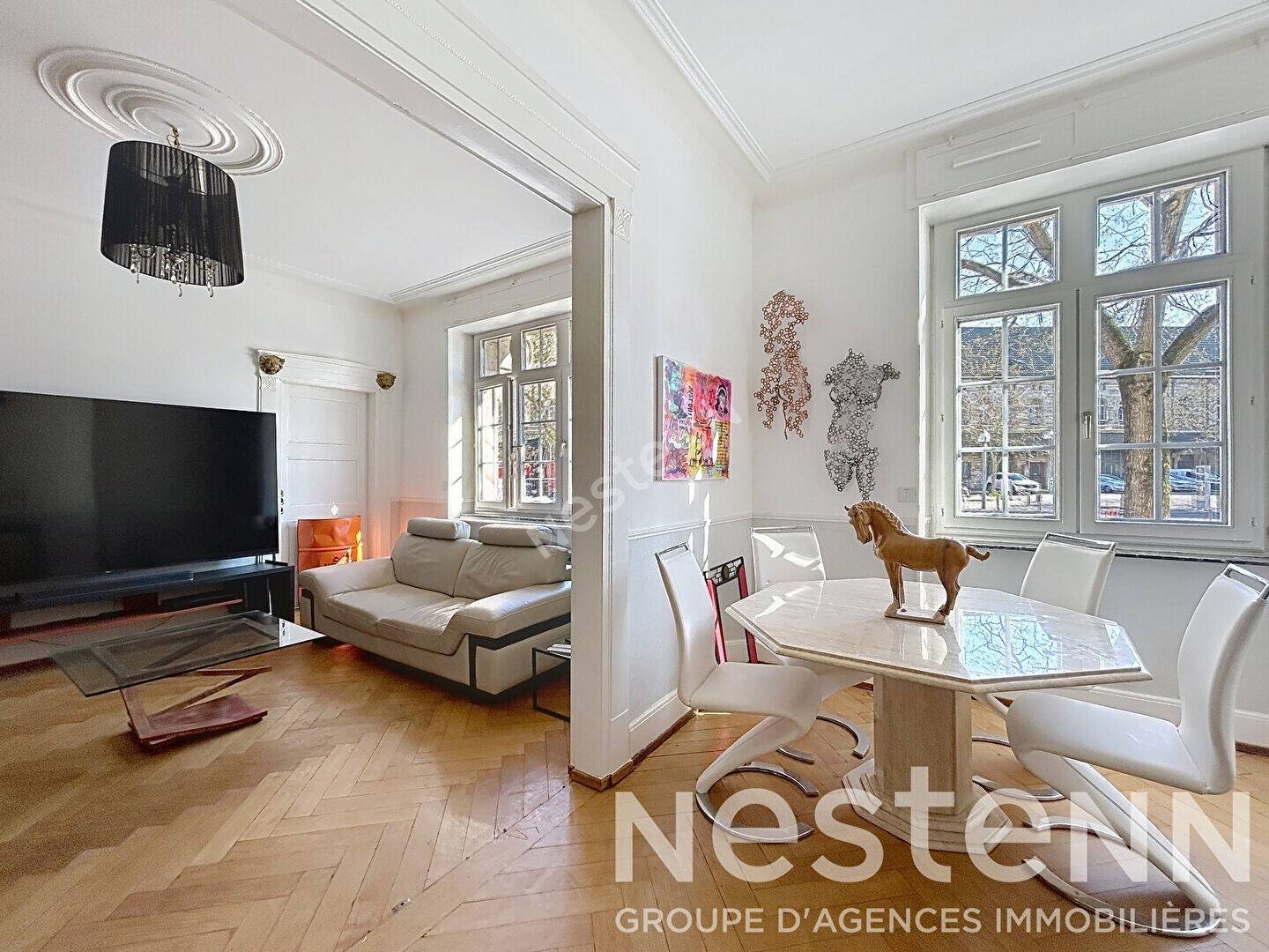 L'agence Nestenn Metz vous présente en exclusivité ce bel appartement bourgeois de 110m² situé en plein coeur du centre ville de Metz à proximité immédiate de la gare et des accès autoroutiers. Erigé dans une bâtisse des années 1900 cette appartement plein de charme se trouve en rdc surélevé d'une petite copropriété. L'agencement de l'appartement, ainsi que les instructions relatives au règlement de copropriété peuvent permettre la réalisation d'un cabinet de profession libérale. En lui même, l'appartement se compose d'une entrée avec point d'eau, d'une cuisine équipée ouverte sur sa terrasse privative, de deux chambres, d'un bureau pouvant faire office de troisième chambre, une salle d'eau, un Wc séparé, et d'un double salon séjour lumineux. Une grande cave isolée et saine vient compléter le bien. Les petits plus : - des travaux de copropriété en cours de réalisation - pas de travaux à prévoir - un bel extérieur au calme - système de détection des mouvements (lumière) - volets roulants electriques - revêtement de sol pour Erp dans le couloir Famille, couple, célibataire ou professionnels, cet appartement saura vous combler. N'hésitez pas à nous pour organiser une visite. Zoé Arthaud (Ei) Agent Commercial - Numéro Rsac : 000 075 - .