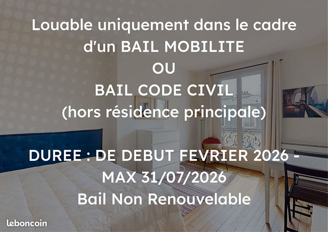Buttes Chaumont Bail Uniquement En Code Civil (Residence Secondaire) Ou Bail Mobilite - Fin Du Bail A Max - Non Renouvelable Votre agence Laforêt vous propose ce studio meublé de 24m² en parfait état, situé dans une copropriété ancienne bien tenue avec gardien. Au 6ème et dernier étage avec ascenseur, au calme et lumineux, disposant du charme de l'ancien, il se compose d'une entrée, d'une salle d'eau avec machine à laver le linge, d' un wc sanibroyeur , d'une pièce principale, d'une cuisine séparée aménagée et équipée. Disponible Au . Honoraires à la charge du locataire de 360 euros pour un bail en résidence principale (Loi 89) ou de 950 euros pour un bail code civil (hors résidence principale).