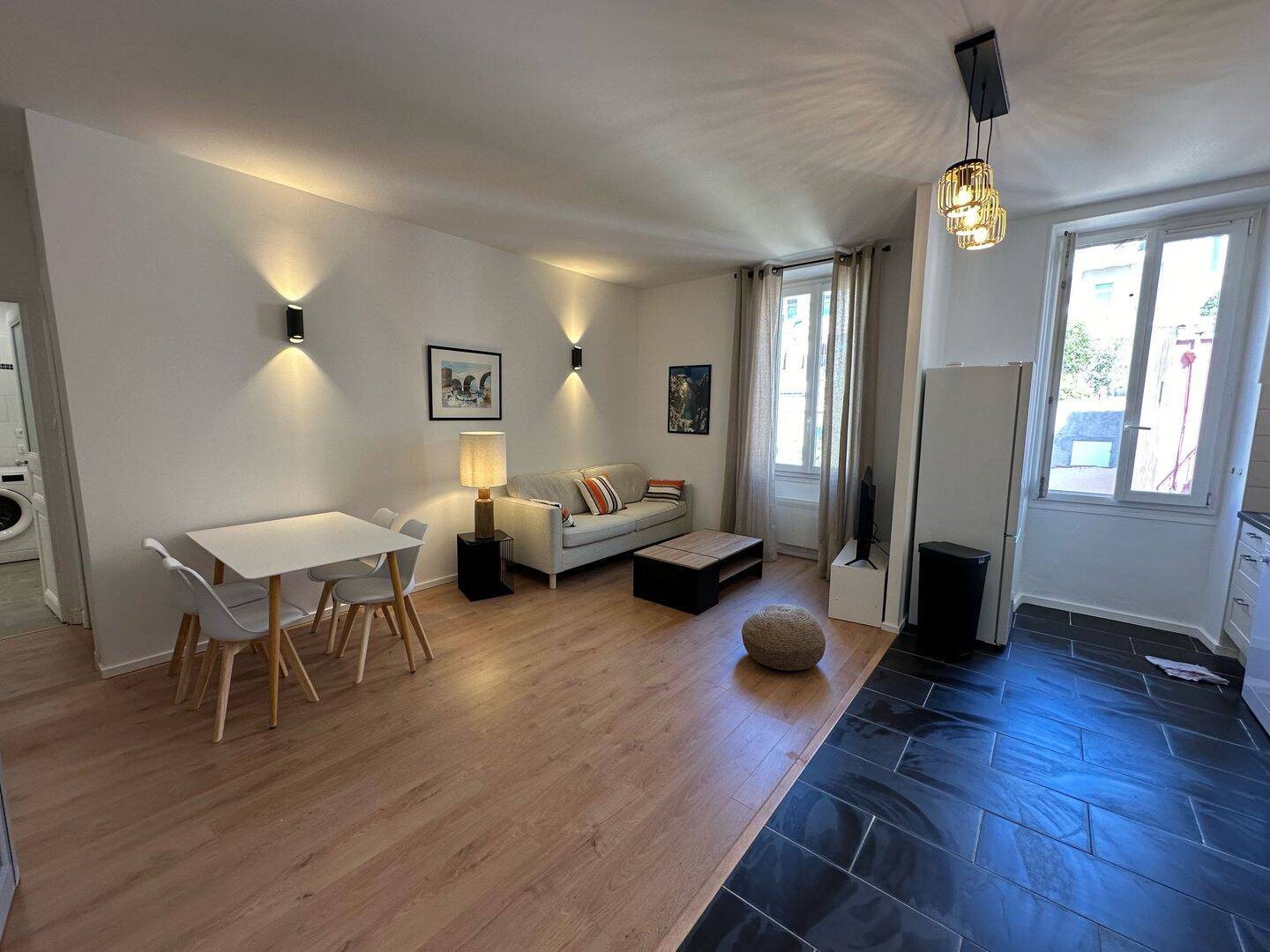 Dans une copropriété en haut d'une impasse, au 1er étage, grand T2 de 54m2 comprenant un séjour avec cuisine ouverte entièrement équipée (four, Micro-ondes, lave vaisselle...) décoration contemporaine, mobilier de qualité, salle de bain avec lave-linge, Wc indép...