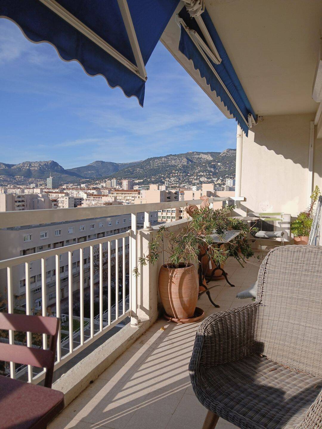 Appartement climatisé de 86m2 , ensoleillé, vue sur le port de Toulon et les montagnes, bénéficiant d'un balcon terrasse de plus de 14 m2 avec trois store bannes électriques. Aucun travaux à prévoir ni dans l'appartement ni dans l'immeuble. 2 chambres, un gr...