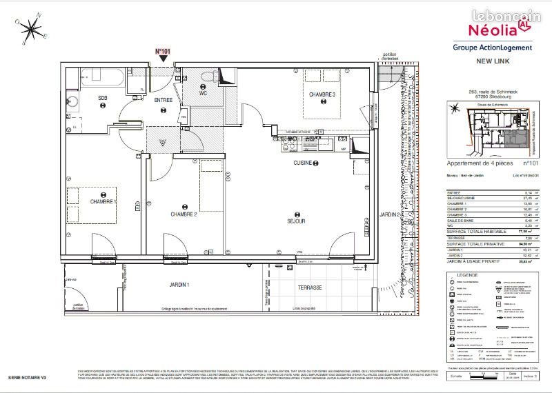 Programme Neuf - Livraison Prevue Au Nous vous proposons la location de ce T4 de 77m2 en rez de jardin situé au 263 Route de Schirmeck 67200 Strasbourg. Il se compose d'une pièce de vie de 27.45m2 avec cuisine ouverte meublée, 3 chambres, 1 sdb avec baignoire et 1 Wc séparé. 1 terrasse et 2 jardins de 13m2 complètent ce bien. Le chauffage est collectif (plancher chauffant) Possibilité de louer une place de parking en sous sol au tarif de 40.93 euros/mois. Pour plus de renseignements, nous vous invitons à nous par mail. Sans Frais D'agence ! Ref