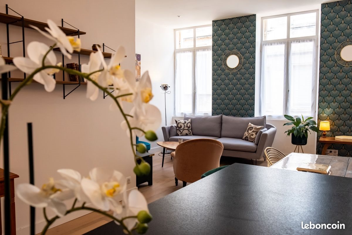 T3 meublé (67m²), cœur du quartier piétonnier et prisé des chartrons. Loyer : 1670 € /mois + forfait de charges 230€. Sont incluses dans ce montant l’ensemble les charges/dépenses : charges de copropriété, taxe ordures ménagères, abonnement/consommation eau et électricité, Fibre Internet/TV. S’Agissant d’un forfait de charge, il n’y aucune charge complémentaire à prévoir (seule l’assurance habitation reste à la charge du locataire). Ce bien est loué en bail code civil à usage de résidence secondaire Uniquement ou bail société/bail mobilité suivant profil (pour mutation, mobilité professionnelle, changement de situation familiale, travaux dans résidence principale, hospitalisation d’un proche etc…) Ce bien a été refait à neuf en 2018 (incluant un parquet massif réalisé par un artisan parqueteur), ravalement de la façade en 2022, renovation complète des menuiseries en janvier 2024. Il se situe au 1er étage d’un petit immeuble en pierre de 2 étages, rue Pomme d’Or, à deux pas de la rue Notre Dame « l’âme des Chartrons » qui continue de sentir bon le monde du vin, des antiquaires et des brocanteurs et qui se mélange aujourd’hui aux commerces de proximité (restaurants/musées/galeries/boutiques branchées). A 5mn à pied : Lignes de tram C "Camille Godard" et B "Chartrons" et de bus (14 et 4). Situé, à deux pas de la Garonne, accès rapide à la rocade, aux ponts et à la gare Sncf. Il se compose de : - une 1ère chambre avec un lit double de 160 x 200 cm, penderie et bureau - une 2ème chambre avec deux lits simples de 80 x 200 cm (pouvant se réunir pour faire un lit double), placard/penderie - une salle de douche avec meubles de rangement et Wc - une cuisine américaine entièrement équipée avec four et micro-ondes, lave-vaisselle, frigidaire/congélateur, plaques à induction, bouilloire, cave à vin, Nespresso, grille-pain, table de salle à manger pour 4 personnes et tout le nécessaire pour cuisiner - un salon entièrement équipé Tv- internet/wifi - un patio intérieur couvert avec banquette et un vaste placard de rangement - Équipé de sèche-cheveux, lave-linge neuf, fer et table à repasser, cintres. - Place parking Cité Mondiale à 5mn à pied (80€/mois). Le linge de maison et couettes peuvent être fournis gratuitement sur demande suivant la durée de la location.