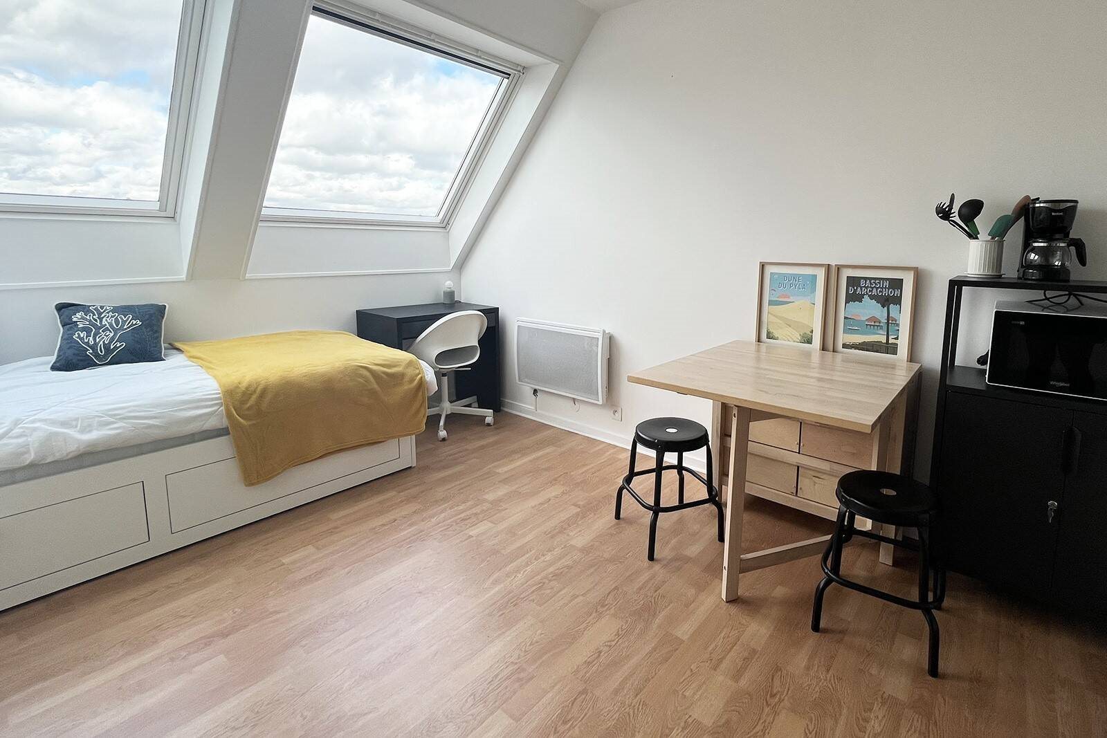 Bordeaux Jardin Public - Fondaudège (avec Tram D à quelques pas), studio meublé de 16,5m² fraîchement rénové, au 5ème et dernier étage (avec ascenseur) dans un immeuble contemporain sécurisé, et comprenant : - entrée - pièce principale avec banquette (convertible ...