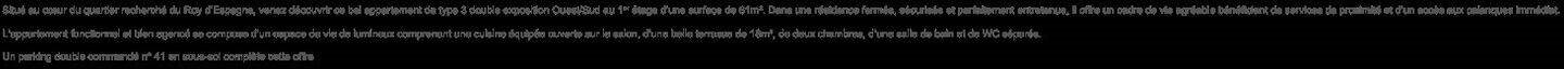 Situé au cœur du quartier recherché du Roy d'Espagne, venez découvrir ce bel appartement de type 3 double exposition Ouest/Sud au 1er étage d'une surface de 61mètres carrés. Dans une résidence fermée, sécurisée et parfaitement entretenue, il offre un cadre ...