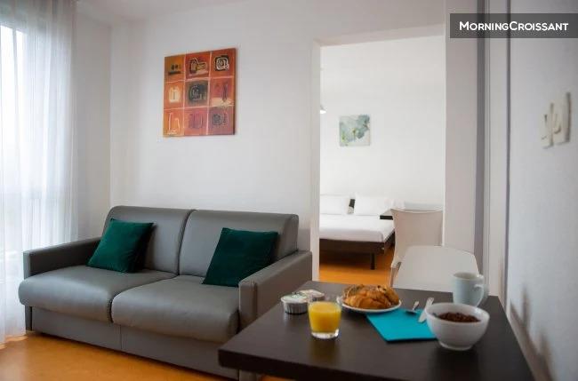 Situé sur les Hauts du Chazal, à flanc de colline, l'établissement bénéficie d'une situation idéale, à seulement quelques mètres d'une station de tramway desservant directement la gare et le centre-ville en 20 minutes. En voiture, vous pouvez rejoindre le technopôle Temis et le centre d'exposition et de congrès Micropolis en 10 minutes, ou encore la zone commerciale de Châteaufarine en 5 minutes. La résidence est aussi bien adaptée pour vos séjours touristiques que professionnels. Composé d'un espace de vie avec canapé-lit (140 180) et cuisine équipée, d'une chambre avec lit double (140 200), d'une salle de bain avec douche et Wc, ce T2 fait 36m2. Il peut accueillir 4 personnes (idéalement 2 adultes et 2 enfants ou 3 adultes étant donné la petite taille du canapé-lit). La cuisine dispose d'un micro-onde, d'un réfrigérateur, de plaques électriques, d'une hotte aspirante, d'une cafetière, d'une bouilloire et de tout ce dont vous aurez besoin pour cuisiner. L'appartement est également équipé d'une Tv écran plat et d'un accès wifi gratuit. Les animaux sont admis avec un supplément à régler sur place. Lors de votre séjour vous pourrez profiter des services hôteliers proposés par la résidence (petit déjeuner, parking et accès à la laverie), le ménage hebdomadaire n'est pas inclus dans le tarif. Vous pourrez arriver à l'heure que vous voudrez grâce à un système de code d'accès à la résidence. L'accueil est ouvert jusqu'à 18h. Si vous prévoyez d'arriver après cet horaire, merci de la résidence pour qu'ils vous communiquent ces codes d'accès. Dans le cadre d'une location saisonnière, en plus du loyer mensuel, une taxe de séjour d'un montant qui varie par nuit et par personne, sera à régler directement auprès de la résidence.